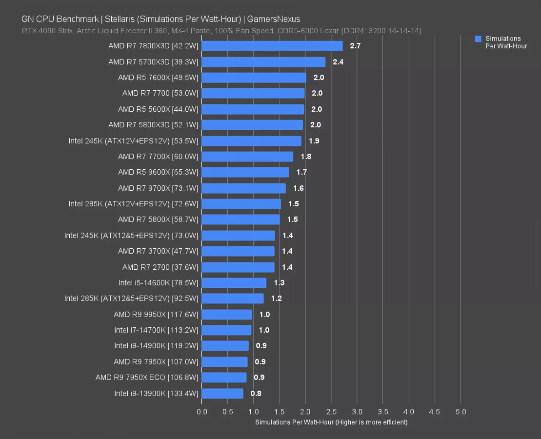 Stellaris shows us simulations per Watt-hour, so higher is better despite the test being in seconds (with lower being better).