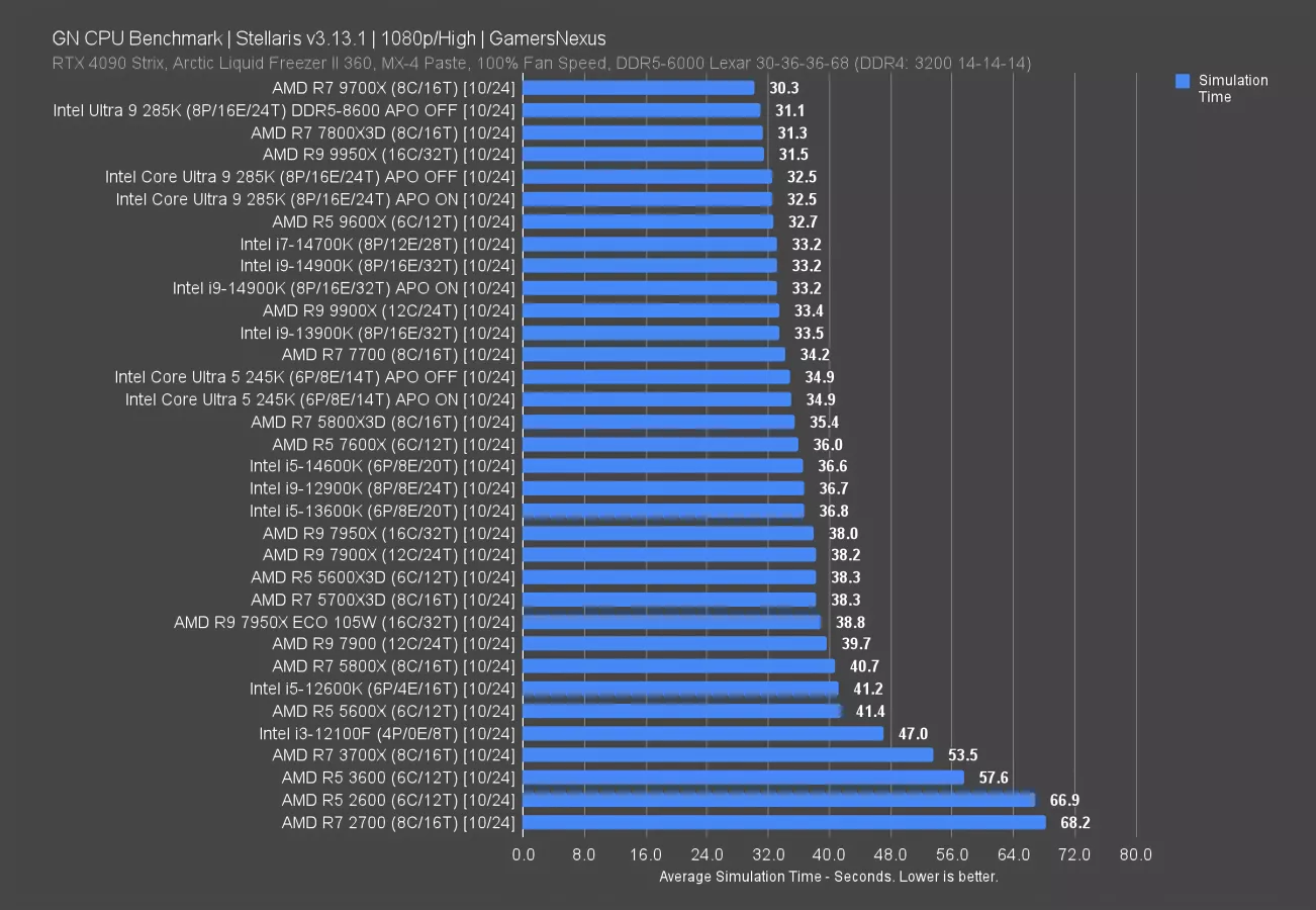 The 245K required 34.9 seconds to complete the simulation, with APO doing nothing for simulation time. The result has the 245K just ahead of the 5800X3D, behind the 7700 non-X, and behind the new 9600X. Zen 5 does well in this particular benchmark.