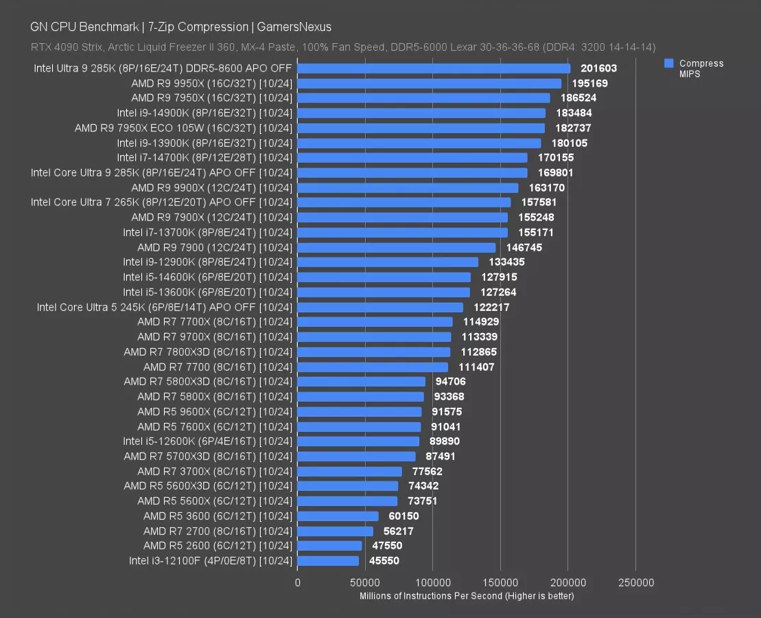 In Decompression, the 265K ran at 168K MIPS and landed just behind the two-generation-old 13700K. The refreshed version of that, the 14700K, is up at 195K MIPS, landing the 14700K ahead of both the 285K and the 265K. The 285K only topples it when upgraded with faster memory, but of course, giving the same treatment to the 14700K would also leapfrog it ahead.