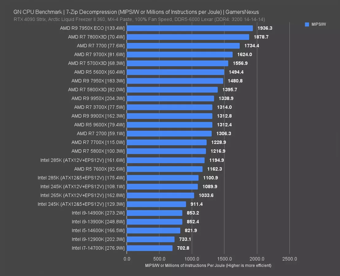 In decompression efficiency, the 265K repeats its rank and falls below the 1194.9 MIPS/W result of the 285K. The power drawn is the same since this test suite runs both consecutively and at about the same power level. The end result is that the 265K is marginally less efficient than the 245K, more meaningfully behind the 285K, and is otherwise mostly just ahead of the prior Intel CPUs. Generationally, the improvement on the 14700K is actually good. It’s 47%. It’s a real uplift, and Intel does deserve credit for that; however, again, the entire top half of the chart is AMD-dominated. It’s just not even close. The 7950X in Eco Mode leads the 265K in efficiency with an advantage of 87%. The 9700X (read our review) is cheaper and also holds a substantial lead, up at 1624 MIPS/W. The 9700X won’t produce as high of a result in this test as the 265K for raw performance, but in efficiency, it is more efficient.