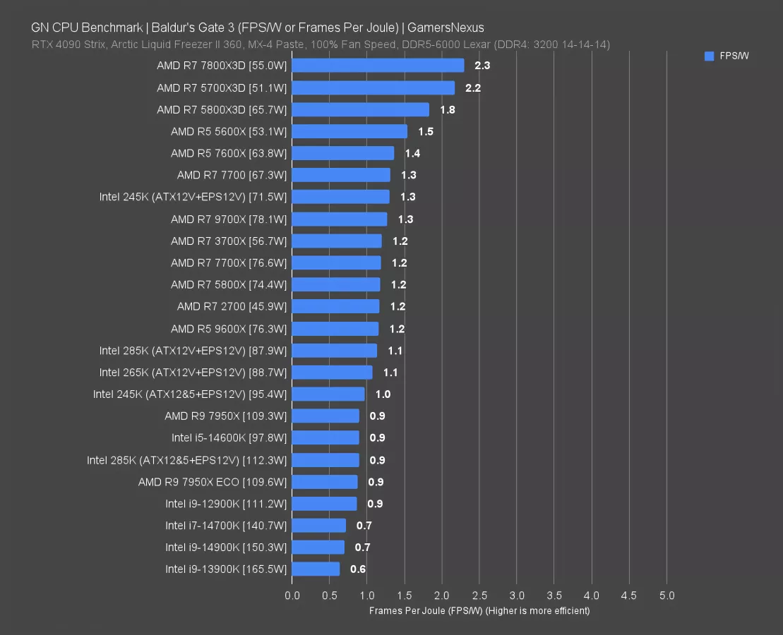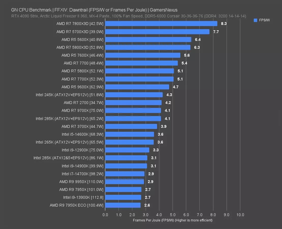 Neither of these is particularly impressive when considering the 7800X3D or 5700X3D, both of which have higher framerate and lower power consumption, resulting in higher efficiency. The 245K (read our review) is more efficient than the 285K and 265K, up at 1.3 FPS/W and tied with the 7700 and 9700X.
