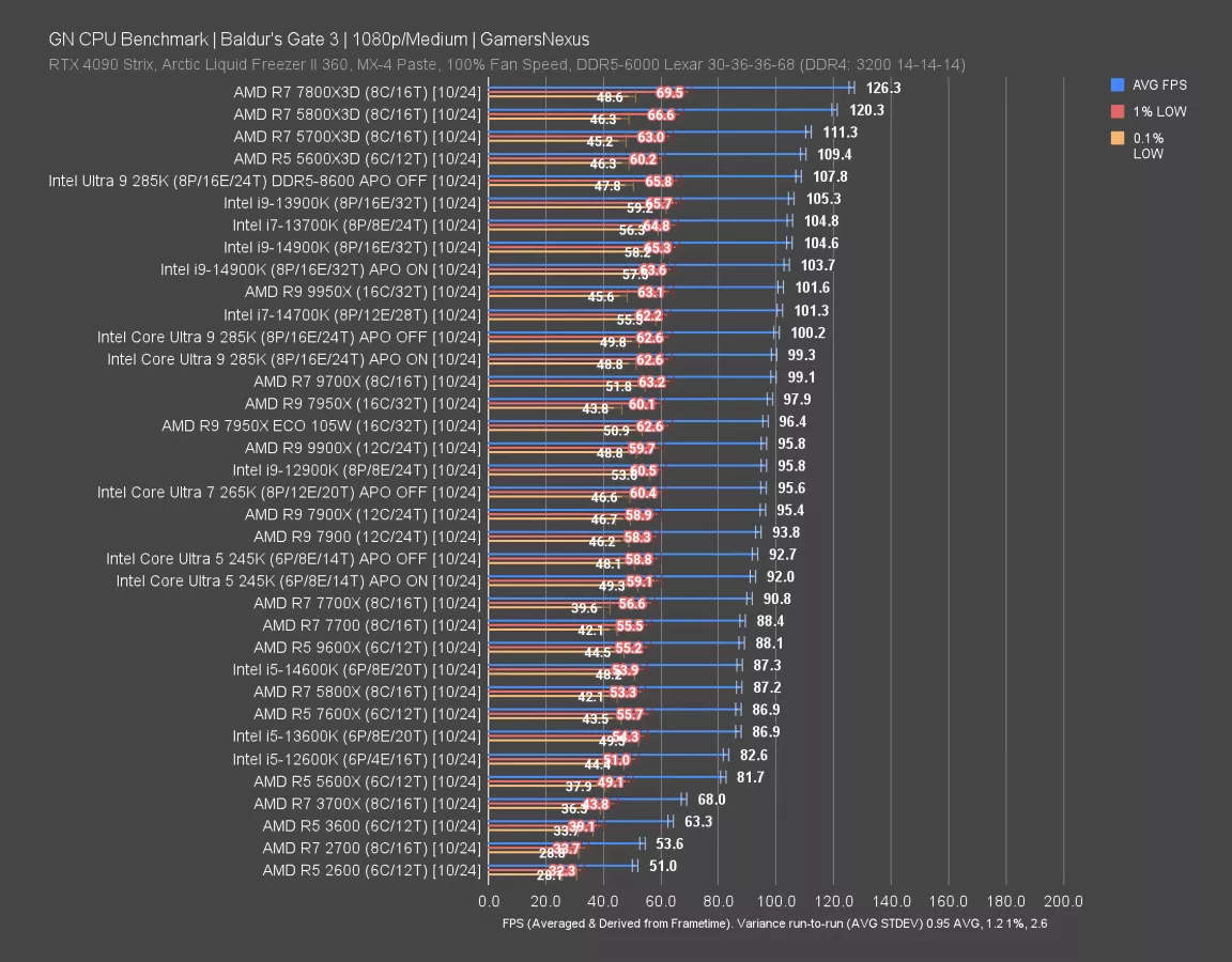Baldur’s Gate 3 had the 265K at 96 FPS AVG, which ties it almost perfectly with the 12900K. That includes tying the 1% lows, with 0.1% close to the usual wider error range. The 265K only leads the 245K by a few FPS on average, rendering it relatively uninteresting. The 245K was already terrible value against alternatives here, and that includes not just the clearly dominant X3D CPUs -- where we have 4, and soon to be 5, topping the chart -- but also Intel’s own prior CPUs. The 14700K leads the 265K by 6%, and for perspective, the 7800X3D leads it by 32%. The 5800X3D (watch our review) isn’t far below that, at 120 FPS AVG. The 5700X3D, which is around $200 to $230 lately (but has been cheaper), has an advantage over the 265K of 16.4%.