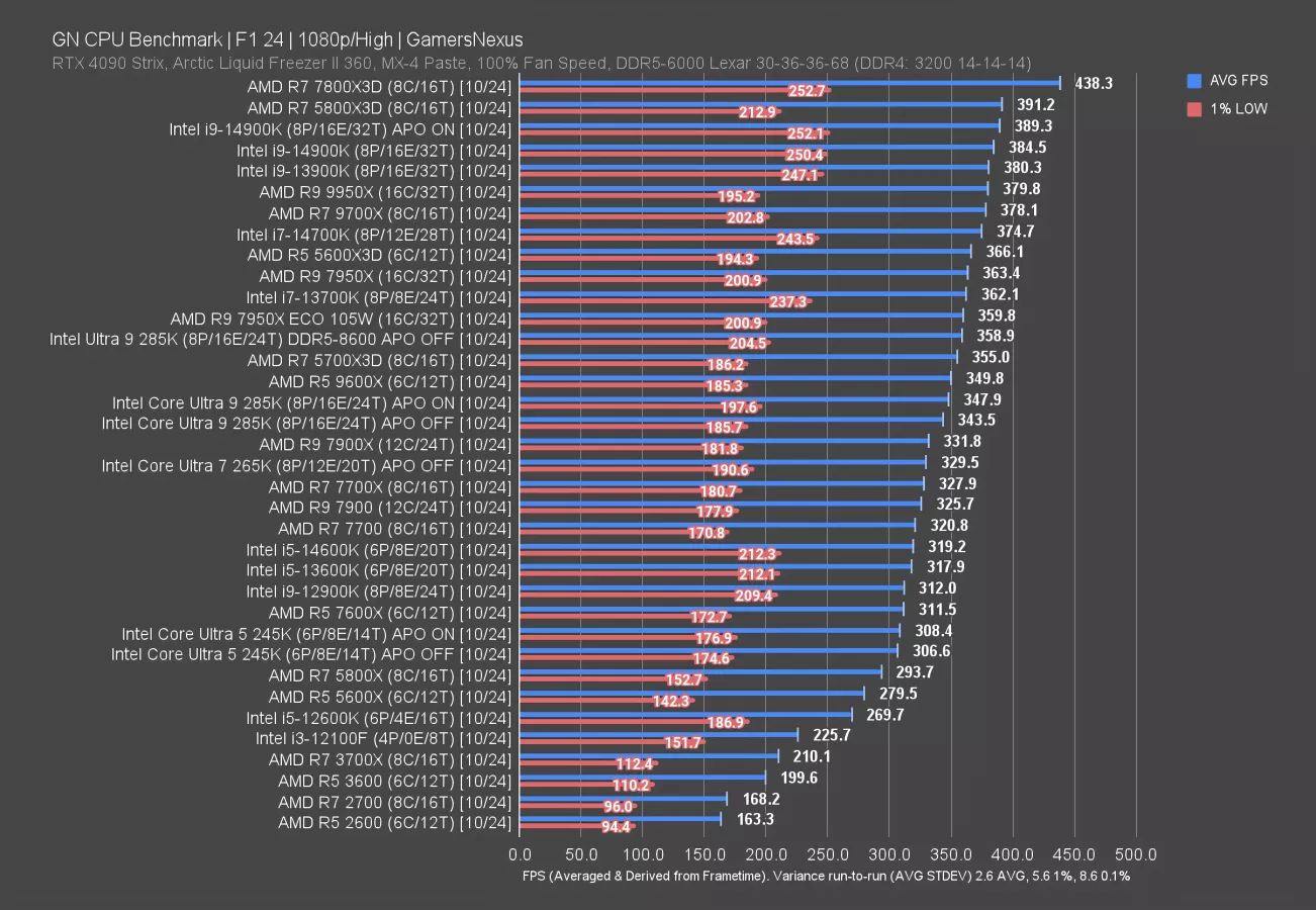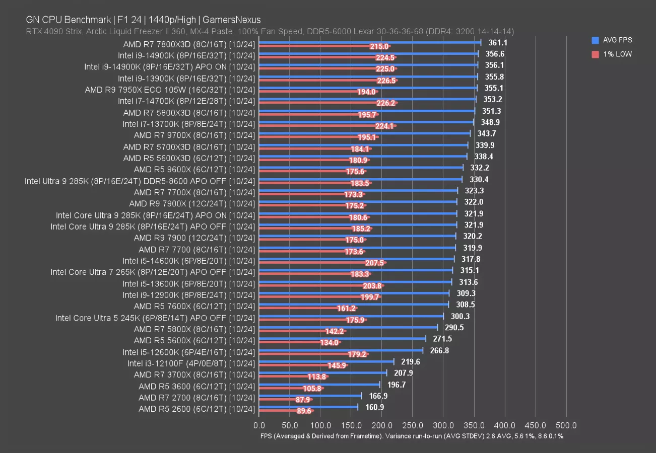F1 24 is up now. In the very least, the gap is wider against the 245K, now with a 7.5% uplift in framerate. Lows increased proportionally with the average.