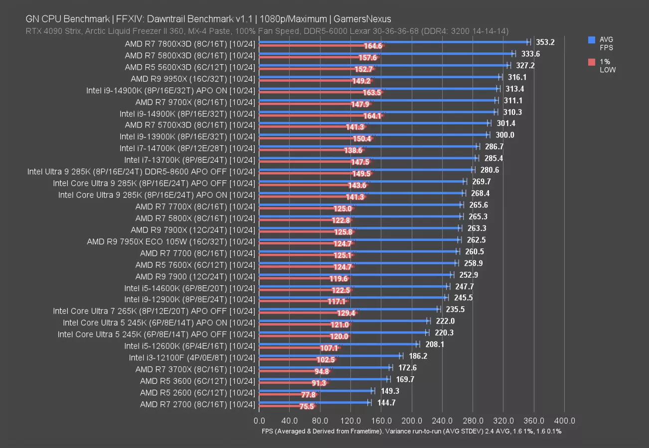 Here’s how it stacks up: The 7800X3D leads the 265K by 20%, the 9600X leads it by 19%, the 14900K with APO off by 13%, and the 285K with APO off by 12%. Even the 7900X (read our review) leads here, and that’s not explicitly been branded as a gaming part, yet competes in both production workloads and price.
