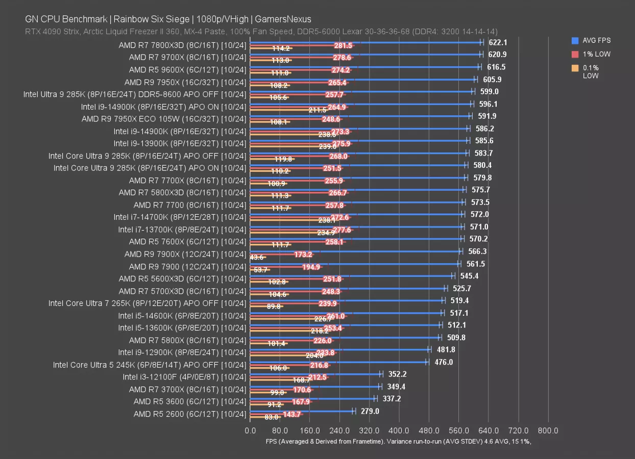 Rainbow Six Siege is up now. In this test, the 265K ran at 519 FPS AVG. We observed that the 285K had frametime pacing issues in this game as compared to the 14 series, which persist here. Our 285K review remarked that we think this may be related to specific optimizations made by the Rainbow Six team, as APO’s benefit has been reduced to effectively nothing.