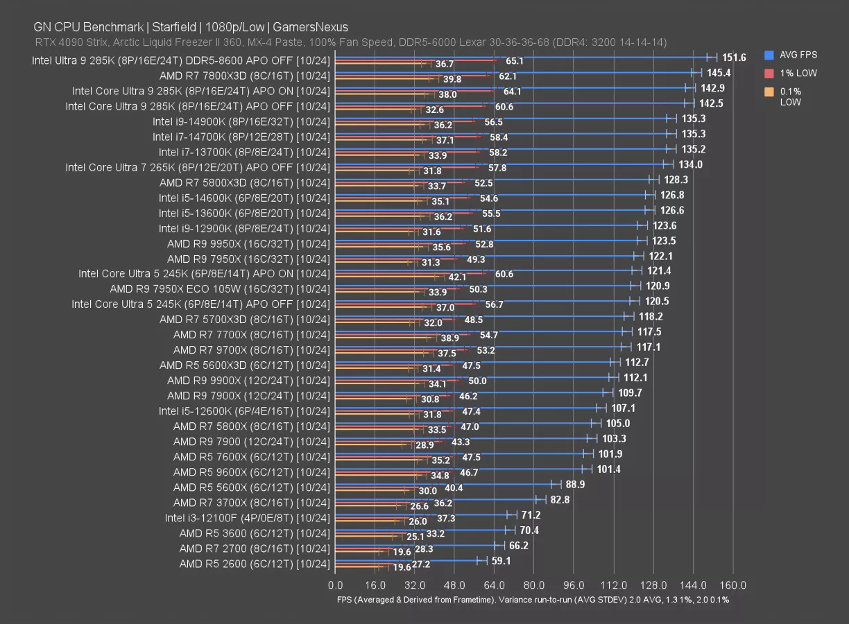 Starfield is up now. This one has the 265K at 134 FPS AVG, just ahead of the 5800X3D and behind the 13700K (watch our review) and 14700K. These two CPUs (and the 14900K) are all bouncing off of another limit, and the 285K with DDR5-8600 makes it appear as if that limit is memory. This is also reinforced by the cache-boosted 7800X3D propelling to the top here.