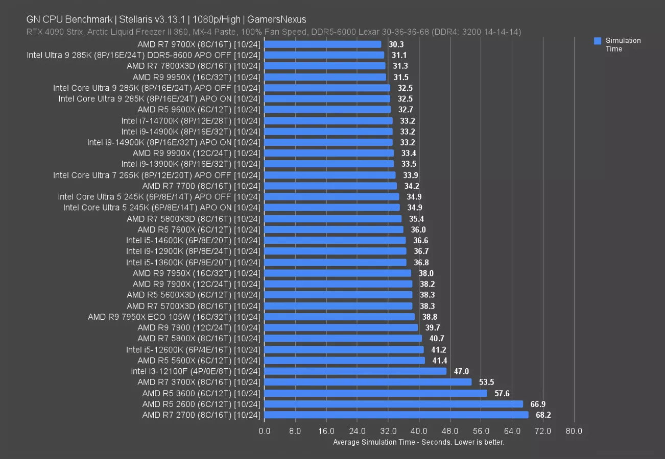 The 265K required an average of 33.9 seconds for its simulation. The 13900K averaged 33.5 seconds, with the 7700 non-X at 34.2. The 14700K predecessor is indistinguishable from the 14900K (read our review) here, with both exhibiting a 2% simulation time reduction from the 265K.
