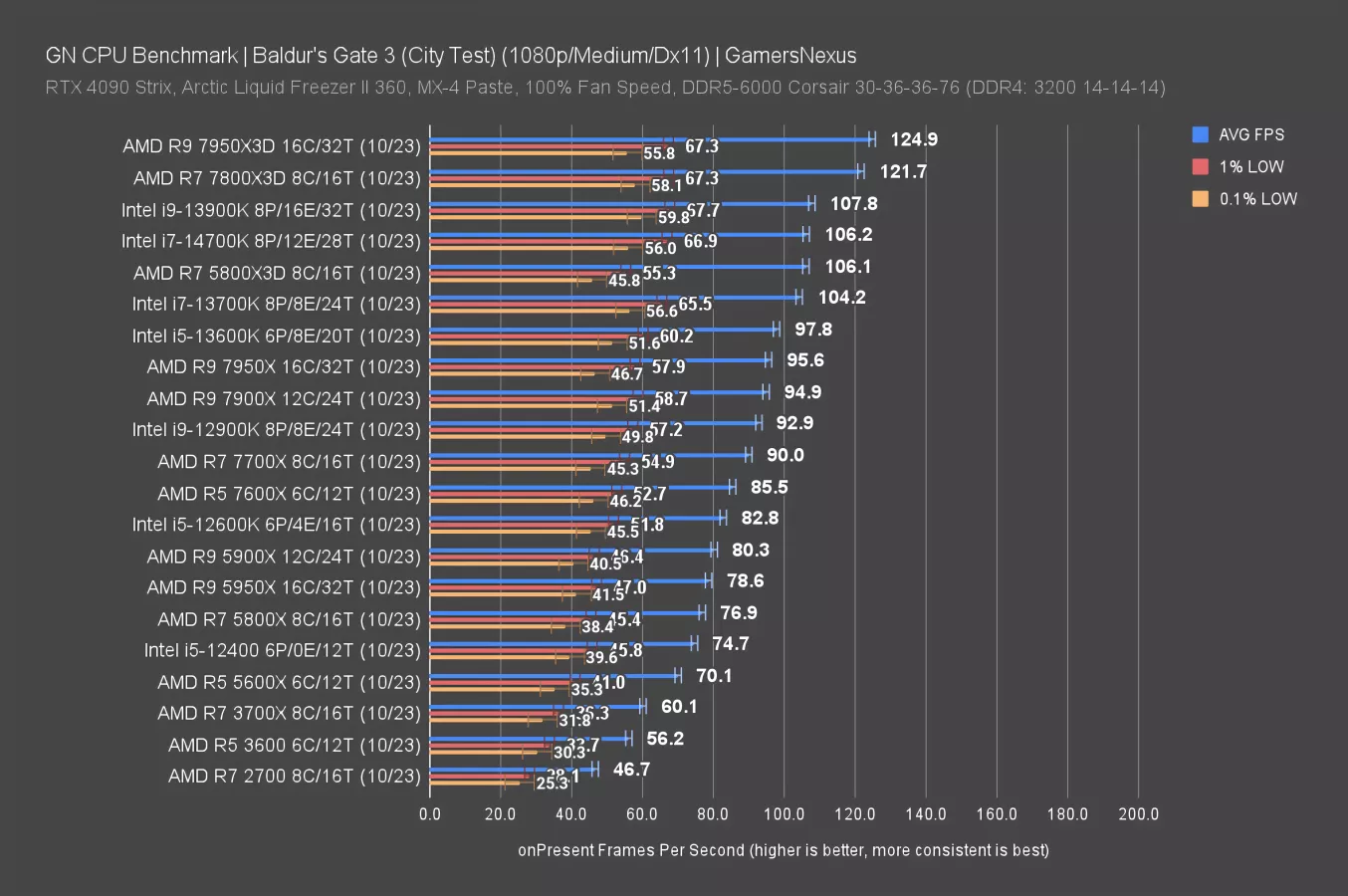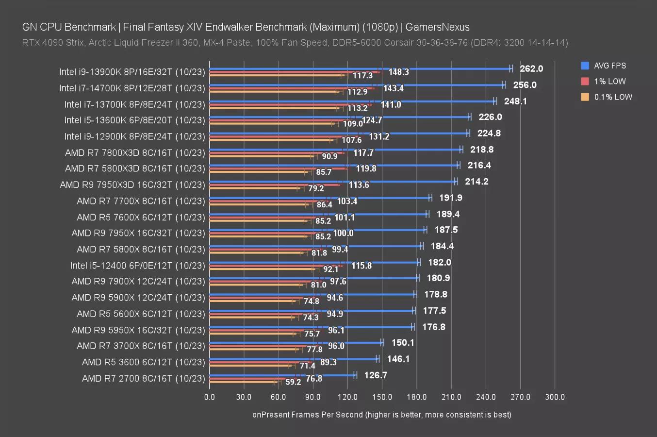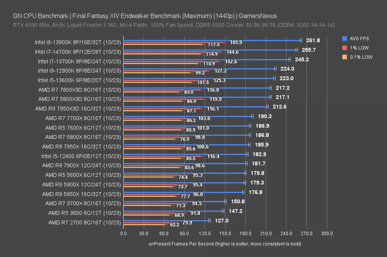The results overall on this chart have come down, even those which were more distant from the GPU bottleneck. We see that with the 5800X, which dropped about 20FPS AVG off of its 1080p result. The 14700K is functionally at the top of the chart, though -- it’s hitting limits, as are the 7800X3D, 7950X, and other nearby neighbors.