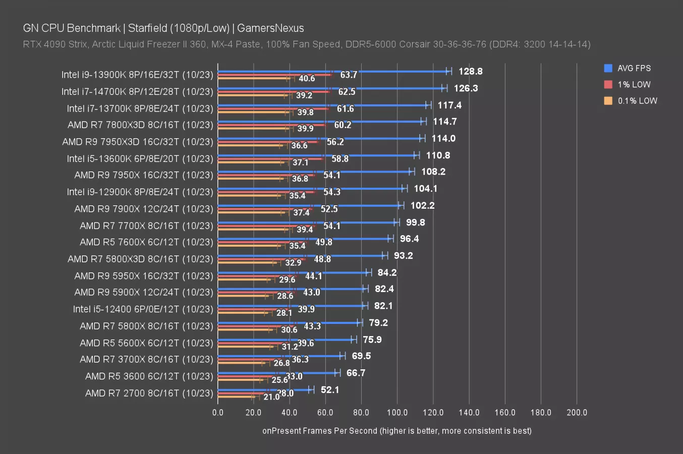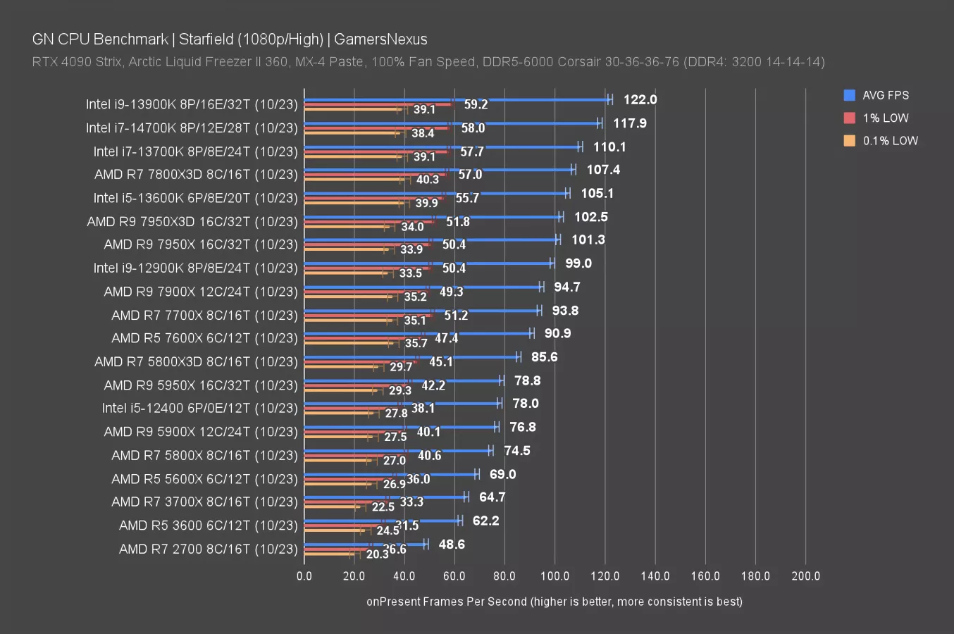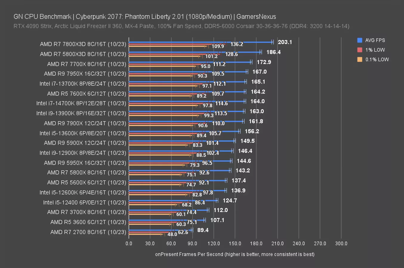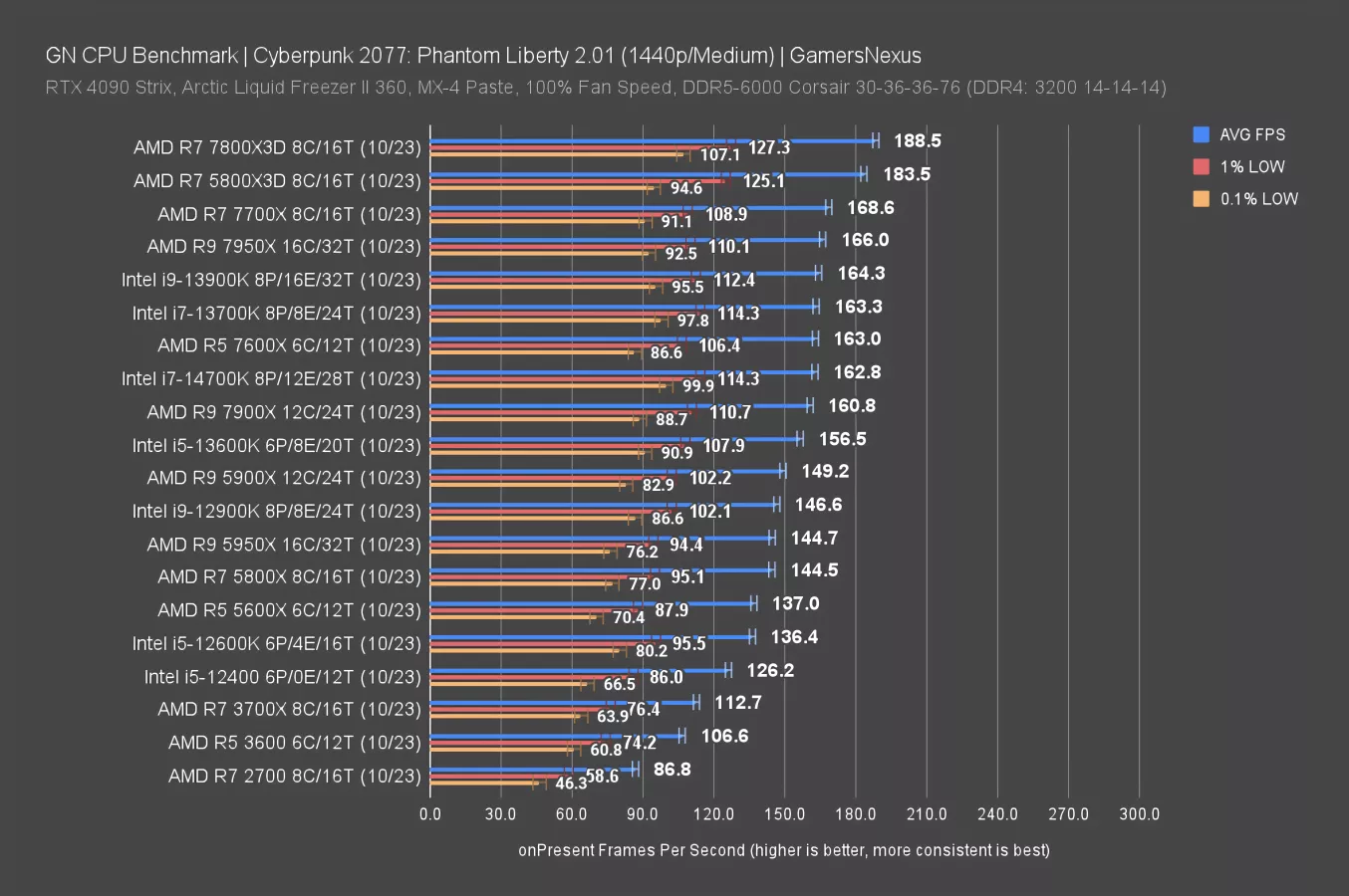 The results overall on this chart have come down, even those which were more distant from the GPU bottleneck. We see that with the 5800X, which dropped about 20FPS AVG off of its 1080p result. The 14700K is functionally at the top of the chart, though -- it’s hitting limits, as are the 7800X3D, 7950X, and other nearby neighbors.