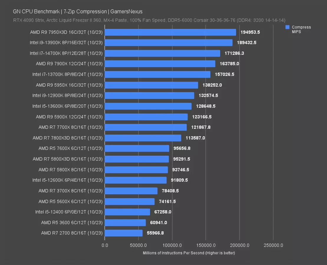 In compression, the 14700K completed 171K MIPS. It’s 9% ahead of the 13700K here. It’s still just an overclocked 13700K, but at least it does something in production. The 7900X is AMD’s closest price competitor, with the 14700K ahead by 4.6%. The 7950X leads by 12%.
