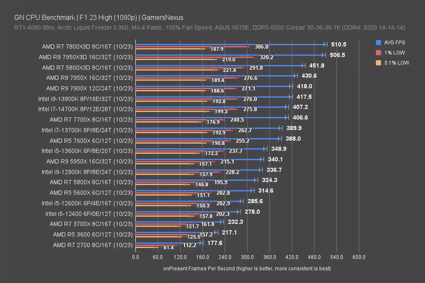 The R7 7800X3D blows way past everything in these charts, setting a ceiling at 717FPS AVG -- that’s impressive for the AMD CPU, especially considering it’s been $350 on US retailers lately.
