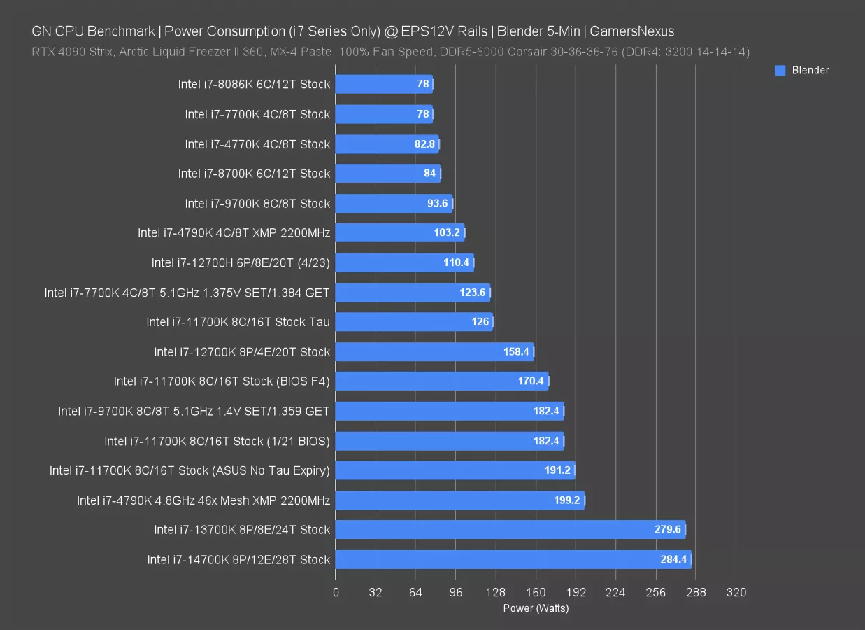 In an all-core workload with Blender, the Intel i7-14700K consumed 284W at the EPS12V rails during the test. That’s power to the CPU and VRM efficiency losses, not total system power -- so it’s a power-hungry chip. But not much different from the 13700K, which itself was around 280W. The Raptor Lake generation is the most power-hungry in all-core of the i7s.
