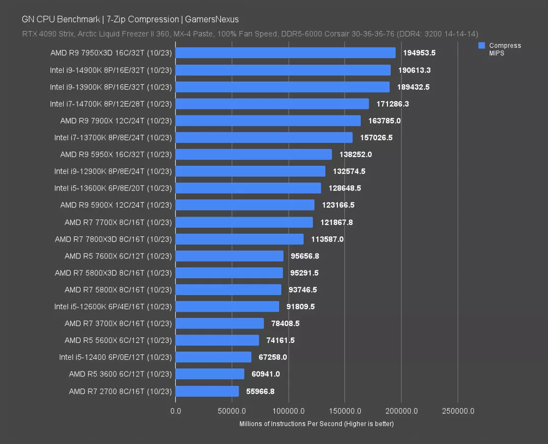 In 7-Zip file compression testing, the 14900K completed 191K MIPS, or millions of instructions per second. That has it about tied with the AMD 7950X and ahead of the 13900K by -- get ready for it -- 0.6%. So again, we’re basically re-reviewing the 13900K. Against the 14700K, that’s an 11% improvement -- if you can call total and utter stagnation an improvement.