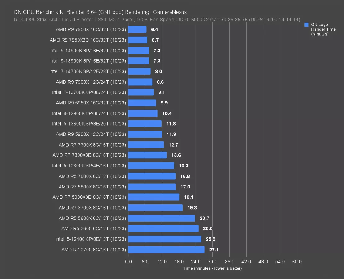 The 14900K required 7.3 minutes to complete the render, which has it dead equal to the 13900K.