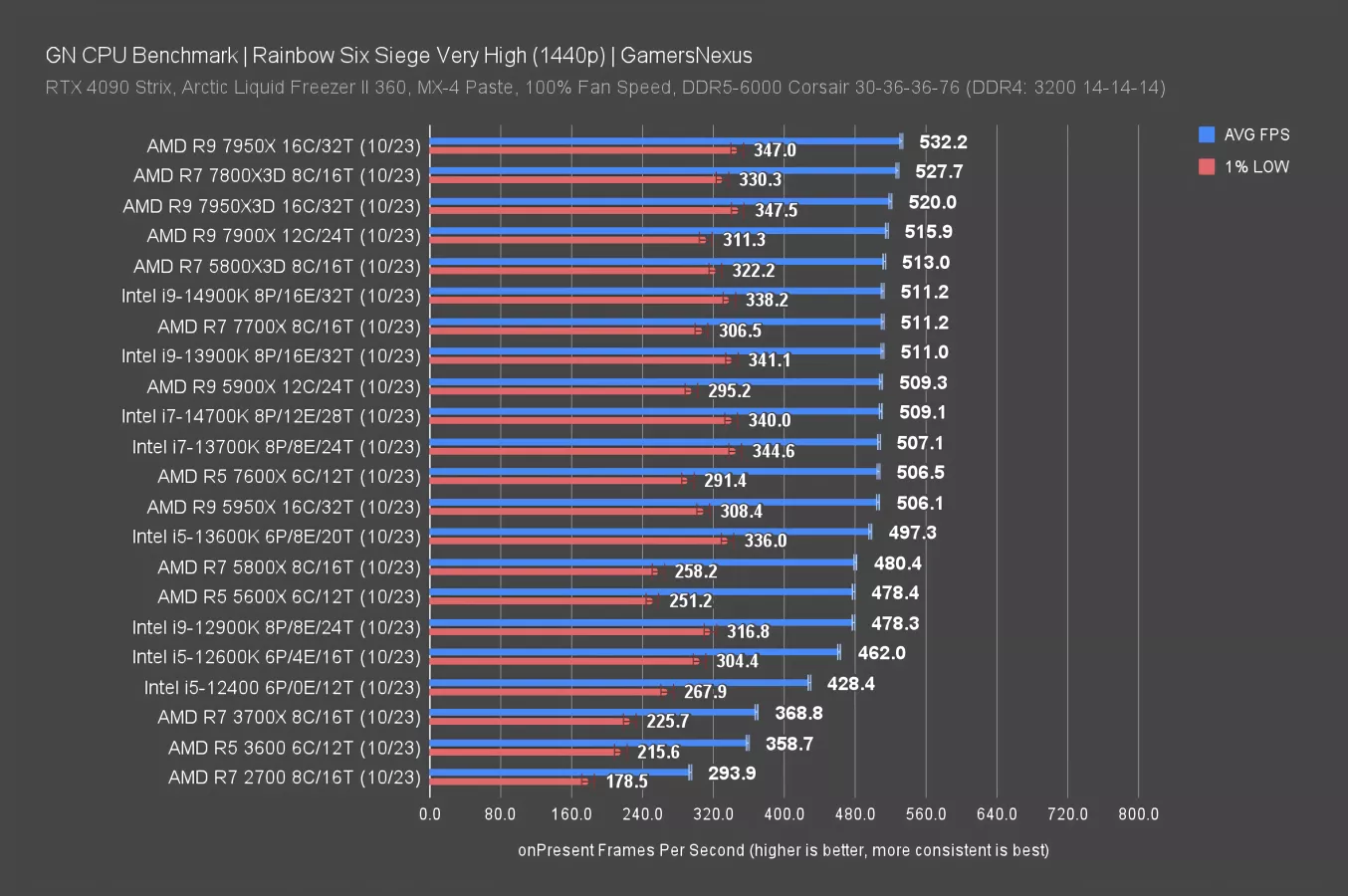 At 1440p, it’s even more riveting. The 14900K leads the 13900K by 0.2 FPS AVG. As you all know, Rainbow Six is a highly competitive game -- so that 0.2 FPS matters. We should give some perspective here. The extra 0.2 FPS AVG means your average frametime is shorter by 0.0008ms.