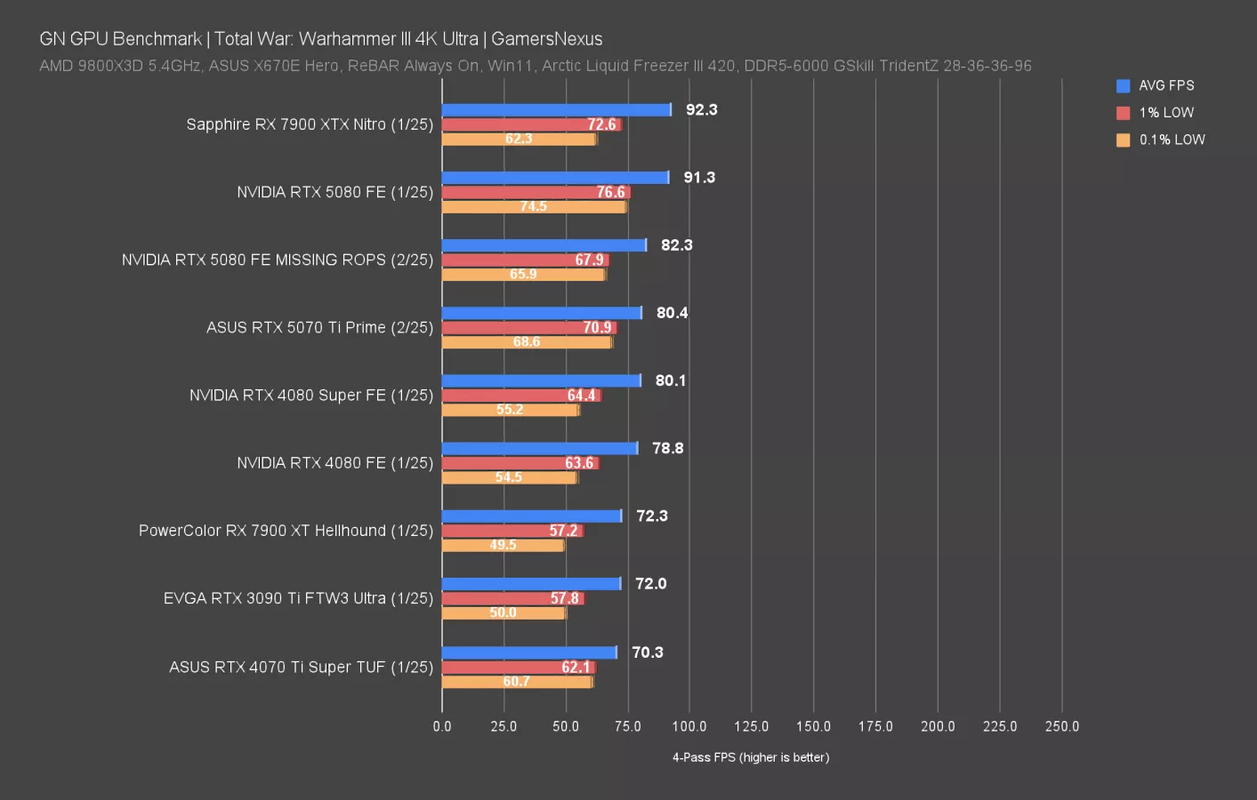 Here’s Total Warhammer III result at 4K. The 5080 “Reduction of Performance” variant ran at 82 FPS AVG, a significant reduction from the correct result of 91 FPS AVG. Before, the 5080 was tied with the 7900 XTX and within error. Now, the 7900 XTX outperforms the 5080 by 12%. That is a huge swing and makes the 7900 XTX significantly better value. Sure, the partners might help you replace a defective model; however, that’d require noticing it.