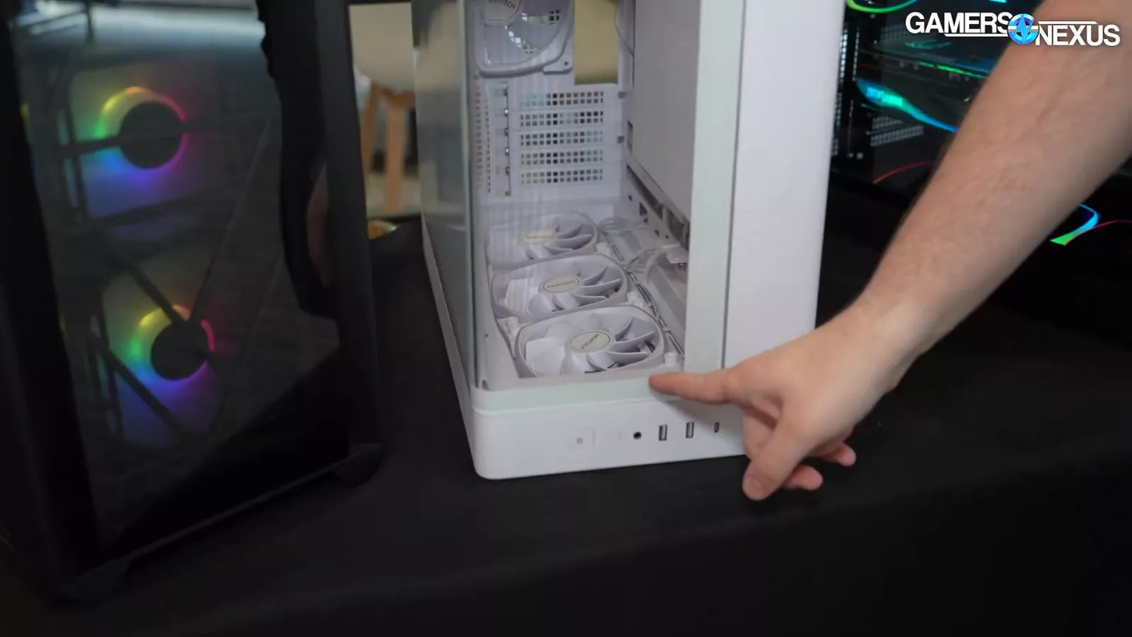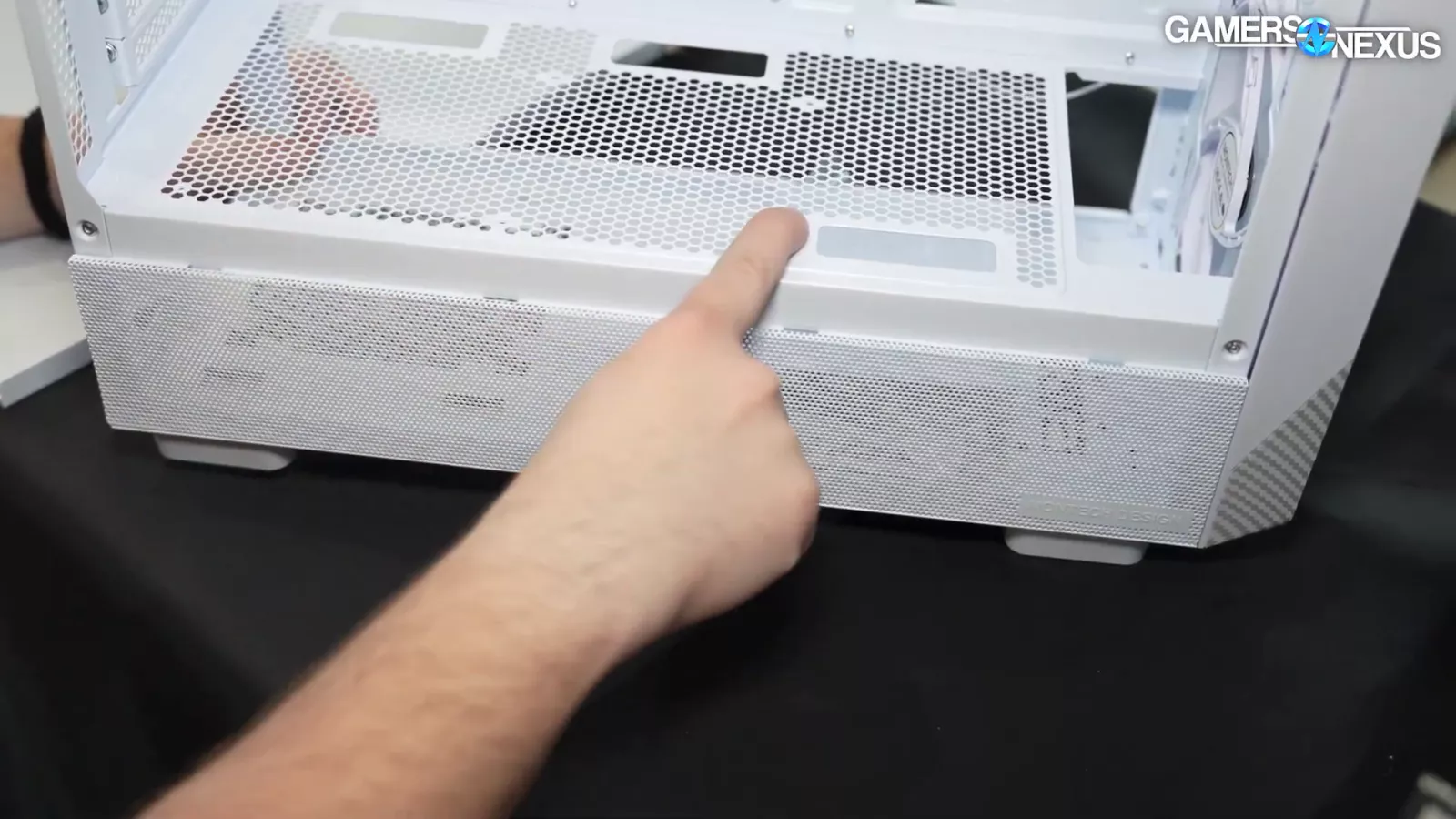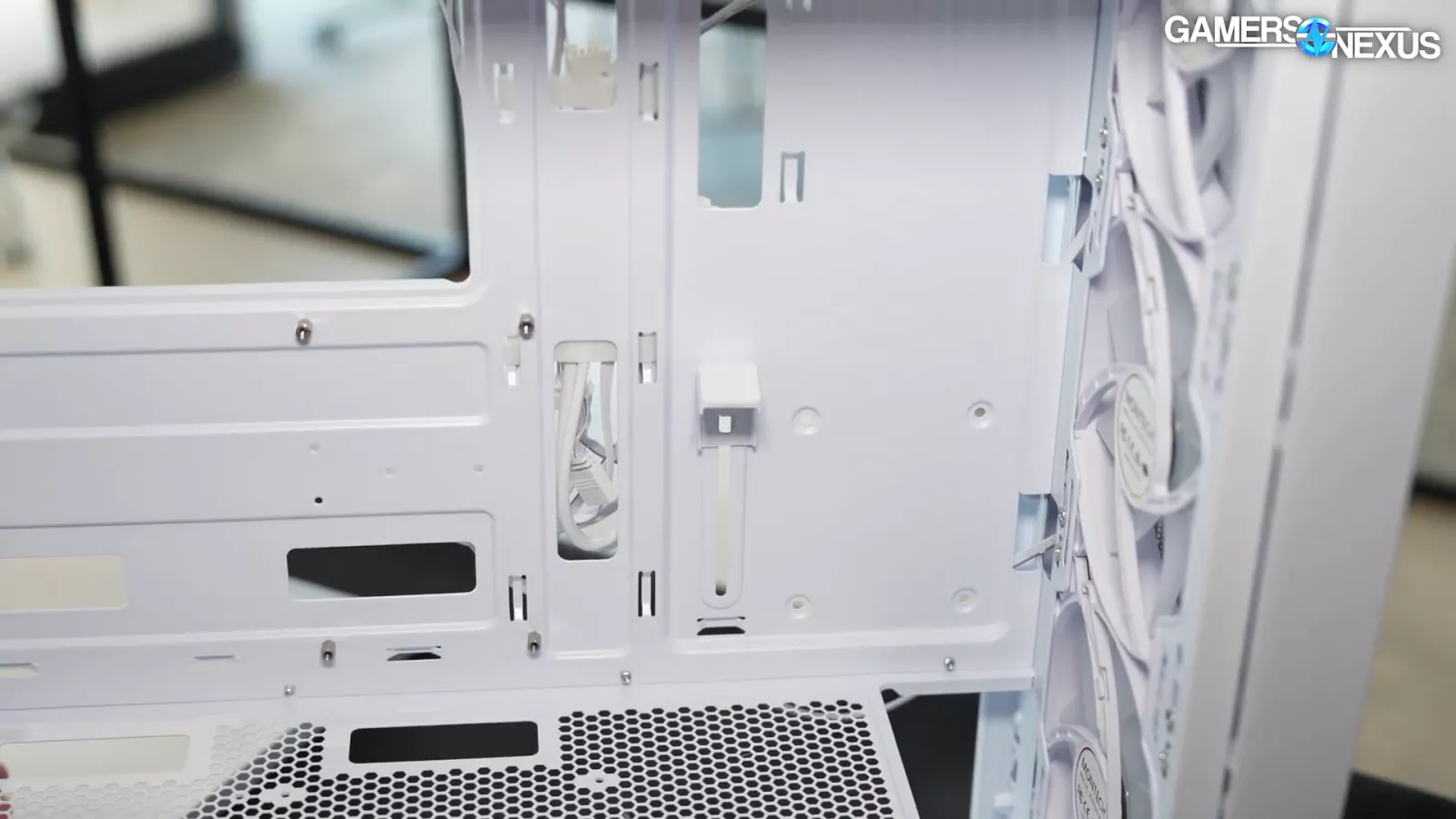 Overall, we have some critiques to the case, but it's finalized. The biggest ones we have for this case include the aforementioned side-panel ventilation and the fact that when the fans are oriented towards the front bottom of the case, the drive cages underneath end up blocking potential air intake from underneath the chassis, but then again, there’s not a lot of space for air to come in through the bottom to begin with. As a result, the bottom fans don’t have much access to intake aside from small ventilated areas.