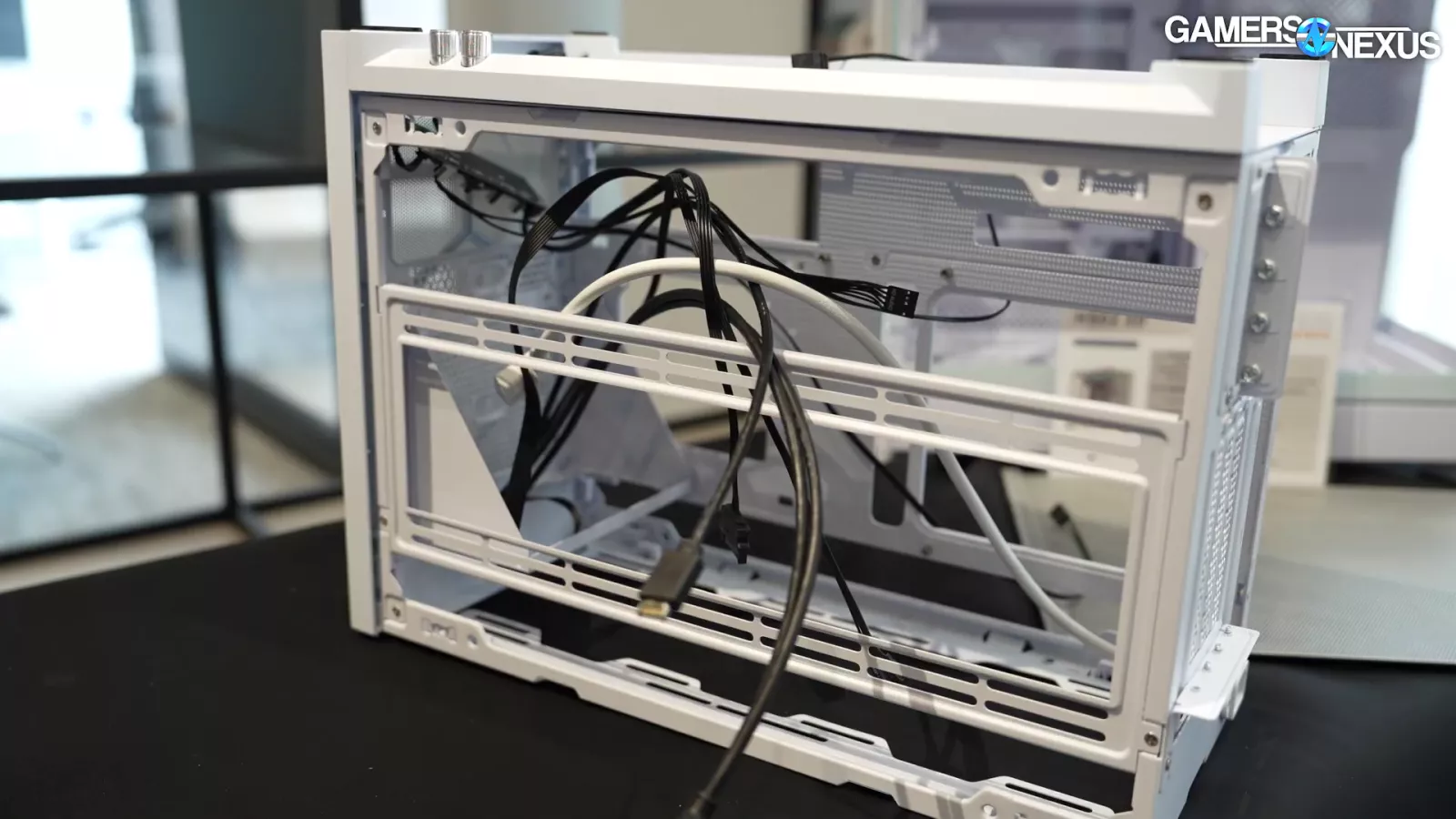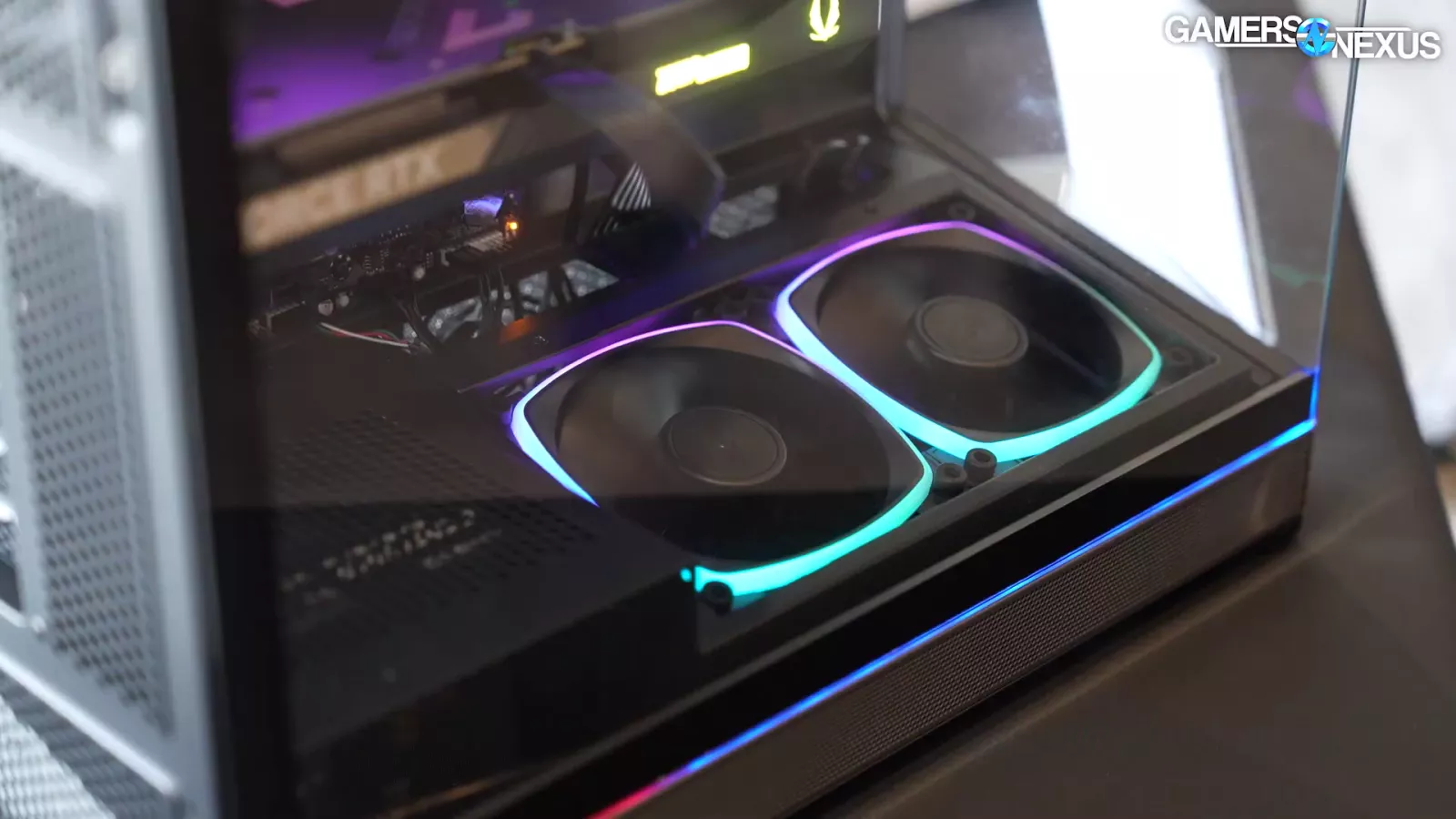 One thing worth pointing out is that its bottom fans are sunken into the bottom, which means they’re pretty close to the floor and the intake is primarily relegated to the back side panel of the case, where there’s a bit of an angle which should help with intake a little, but it’s still somewhat boxed in.