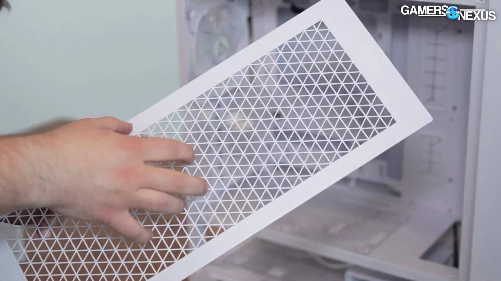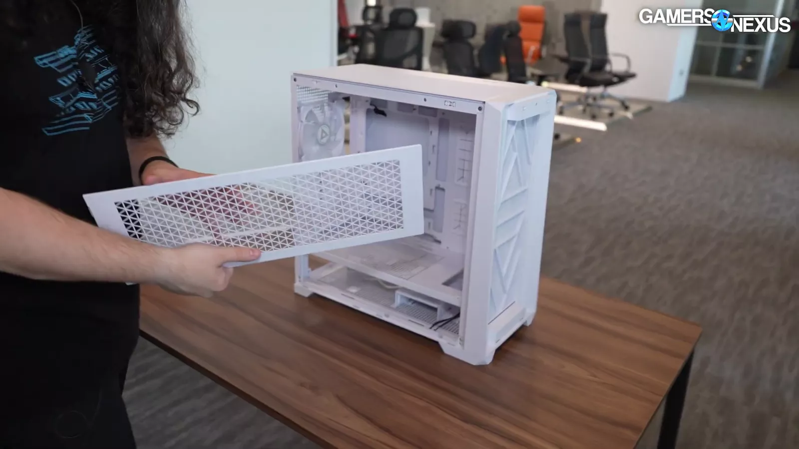 On the back of the case, it has large ventilated holes both vertically and horizontally. Taking the back panel off, one thing we’d like to see is refinement on the magnetic filters. Currently, they’re not done yet but you can see a lot of metal ending up in the hexagon-shaped cut-outs. If they could punch out larger holes or use a finer mesh and get rid of the dust filter or something like that, that would help a lot with thermal performance and letting air through.