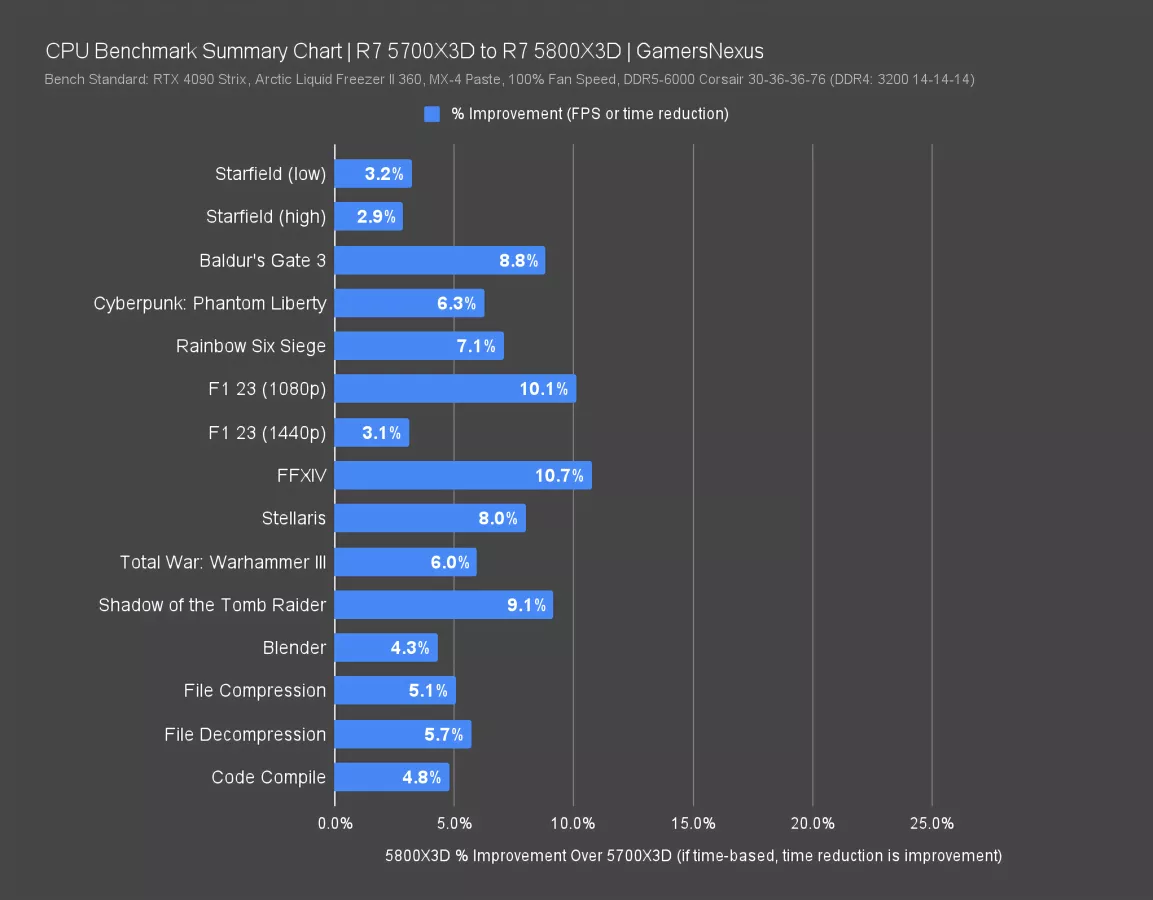 Here’s a simplified summary chart of the 5700X3D vs. the 5800X3D. This shows percent change in the direction of improvement. For time-based benchmarks, we are showing the time reduction as a percent improvement here. That’s because less time is an improvement.