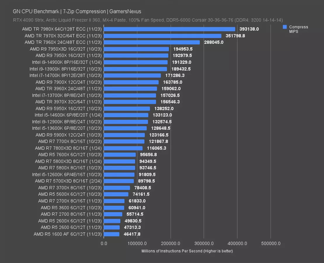 7-Zip file compression is measured in millions of instructions per second. The 5700X3D completed 90K MIPS, with the 5800X3D about 5% ahead of this result. The gap here is smaller than what we saw in most of the gaming tests earlier and is within a range where, functionally speaking, most people can think of the 5800X3D and 5700X3D as the same performance in file compression work.