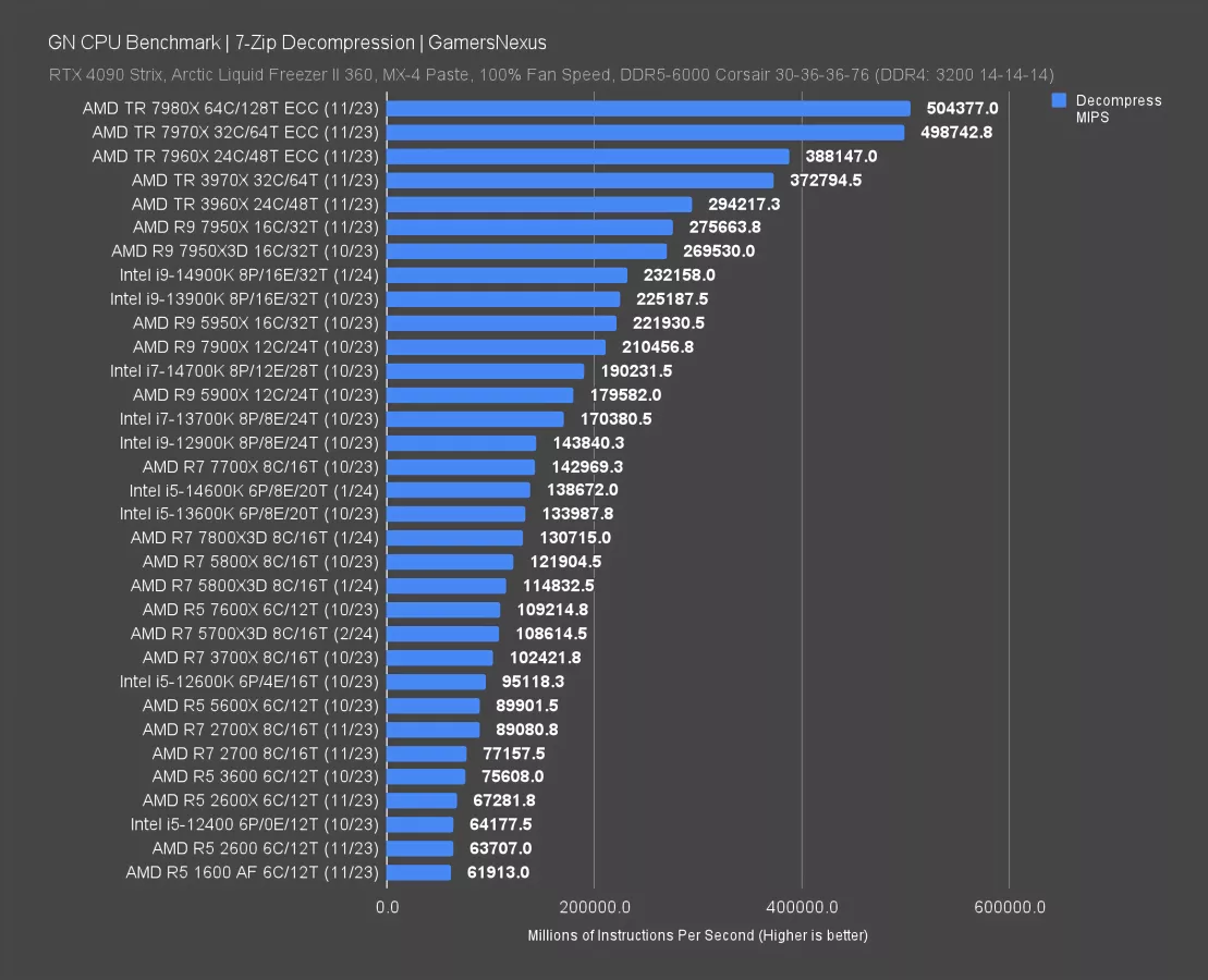 In file decompression benchmarking, the 5700X3D completed 109K MIPS, giving the 5800X3D a lead of 5.7%. The 7800X3D pulls 20% ahead here, with the 7700X further still and benefited from the frequency change. The 5800X non-3D also leads its X3D counterpart.