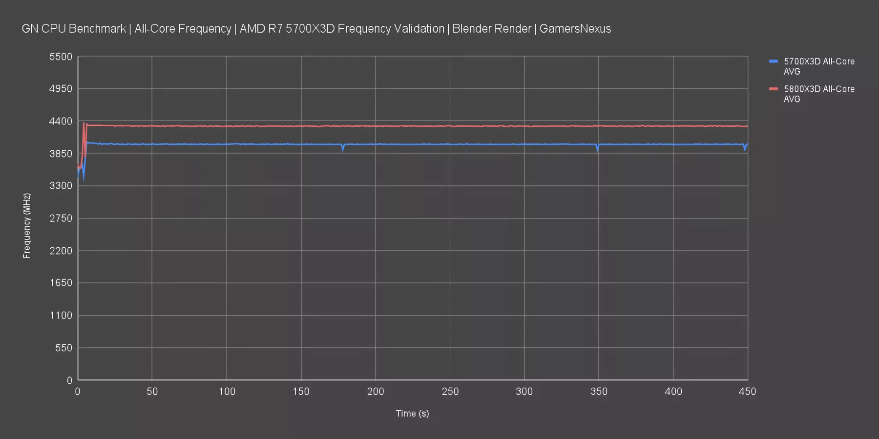 Here’s an all-core frequency chart of the 5700X3D and 5800X3D, using Blender on all threads. The 5700X3D boosts to 4GHz and holds steady for the duration of the test. It is expected behavior that these CPUs won’t hit peak boost clock in all-core workloads.