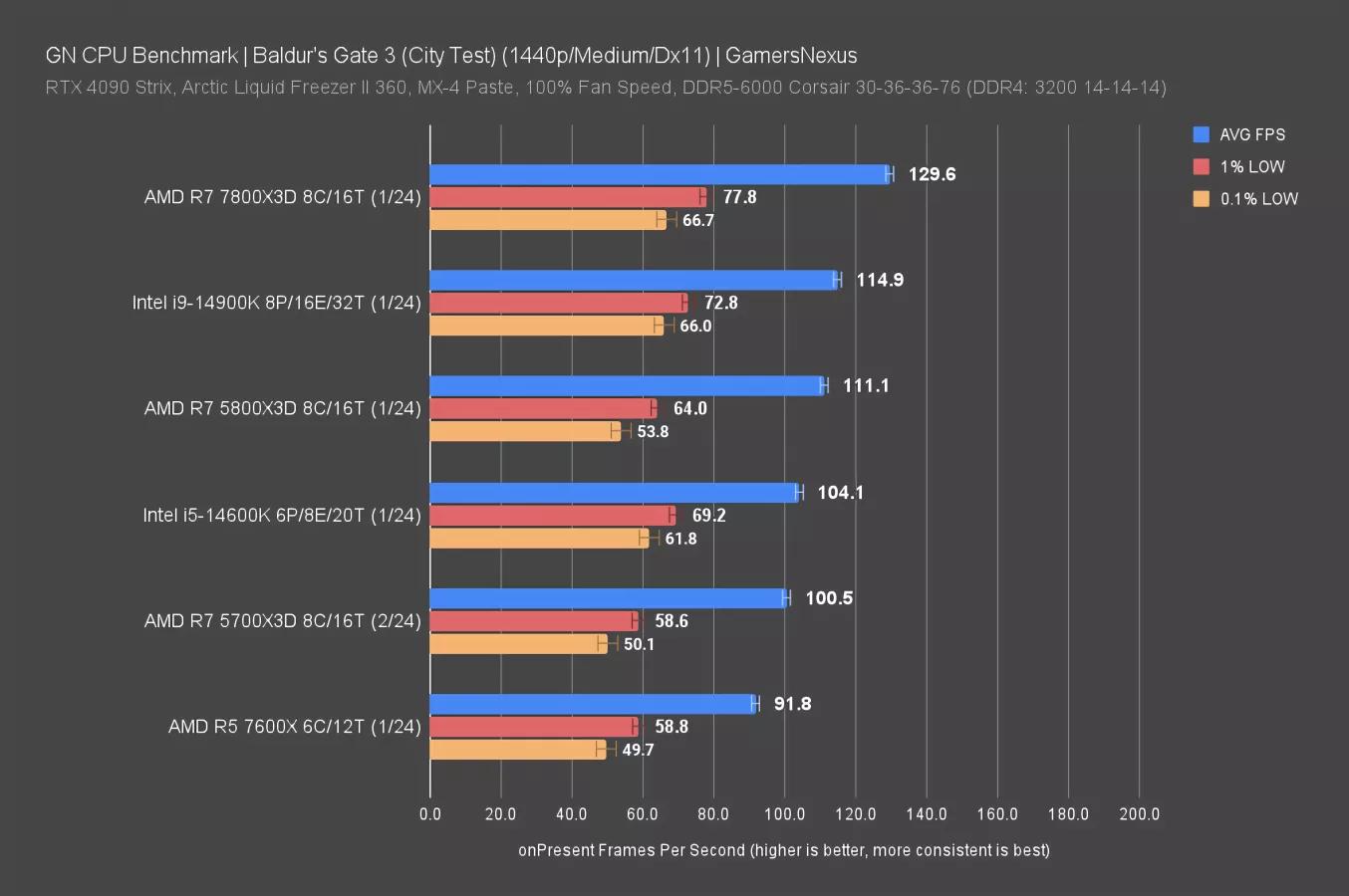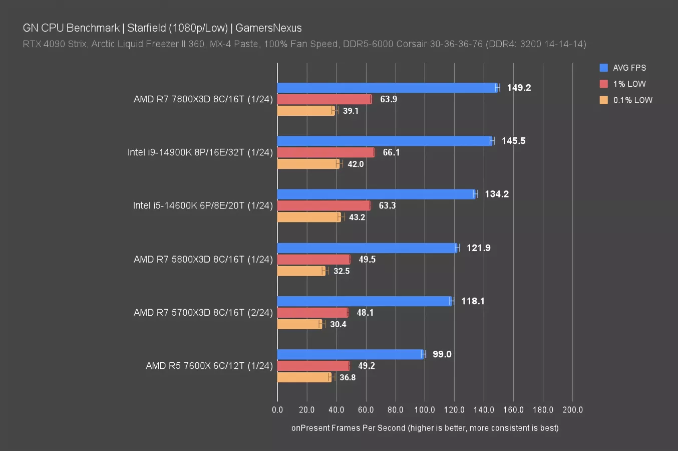 The 5800X3D roughly equated the 5700X3D. As evident from the 14900K and 7800X3D, there is definitely CPU scaling headroom, so we are not limited by external components on the prior generation X3D CPUs. The similarity in performance relates back to a reduction in frequency dependency in this game with its updates, and given the equivalence of core specs for the CPUs, the difference is only a 3% lead for the 5800X3D.