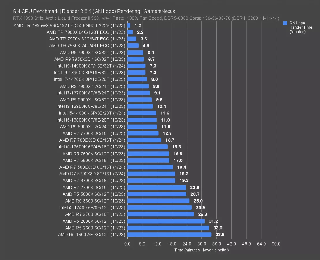 In Blender, the 5700X3D completed our frame render in 19 minutes, meaning the 5800X3D reduces time to render by 4%. X3D CPUs in general don’t provide additional value in this test, and in fact, typically perform slightly worse than the non-X3D counterparts as the frequency is more useful in this benchmark. You can see that in the 5800X result vs. the 5800X3D and in the 7700X vs. the 7800X3D.