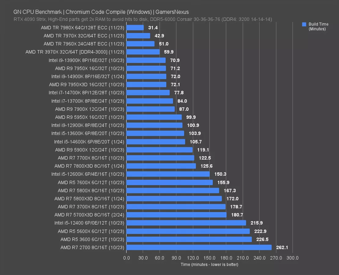 Finally, in Chromium code compile, the 5700X3D required 181 minutes to complete the compile. The 5800X3D used about 5% less time, at 172 minutes. The 14600K leads both of these massively, with a 106-minute result and 41% time reduction from the 5700X3D’s result.