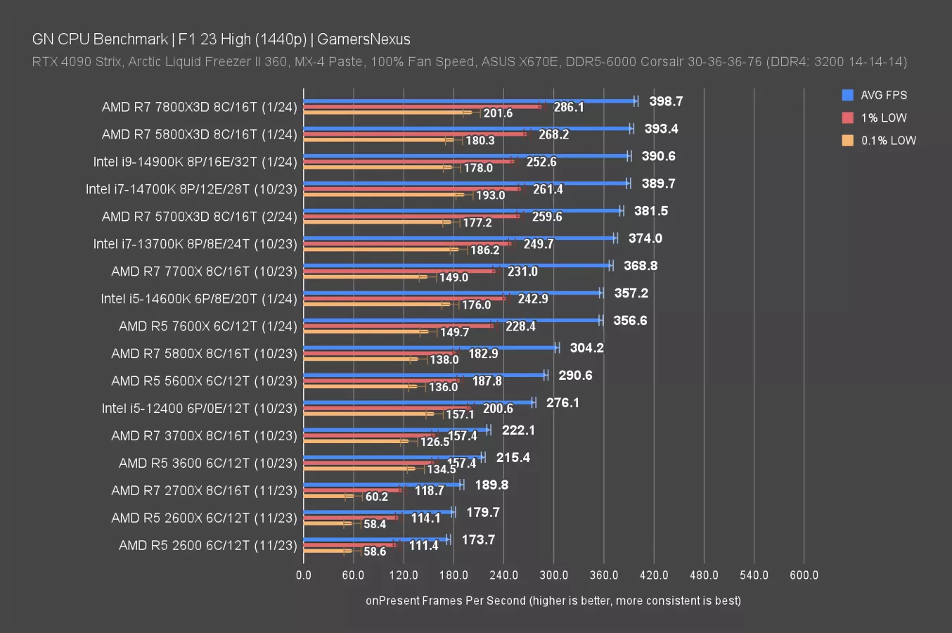 In F1 2023 at 1080p, the R7 5700X3D ran at 410 FPS AVG, establishing about a 40 FPS gap between it and the R7 5800X3D. The 5800X3D therefore leads by 10% again. The 7800X3D on AM5 leads by 24%. The 5700X3D ends up surrounded by some of Intel’s newer parts, with the 14900K (read our review) and 14700K flanking. It outperforms the 14600K meaningfully while being cheaper at time of writing, at $250 to $300.