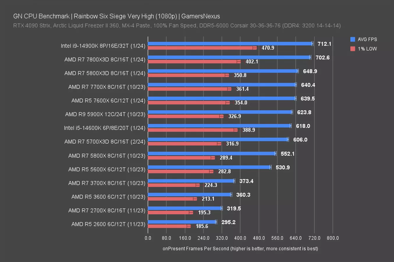 At 1080p/High, the 14900K and 7800X3D (watch our review) become constrained by GPU requirements, despite the RTX 4090. The 5800X3D is about 3% better than the 5700X3D and neither hits the GPU ceiling. The 14600K maintains its 13% lead over the new R7 5700X3D CPU.