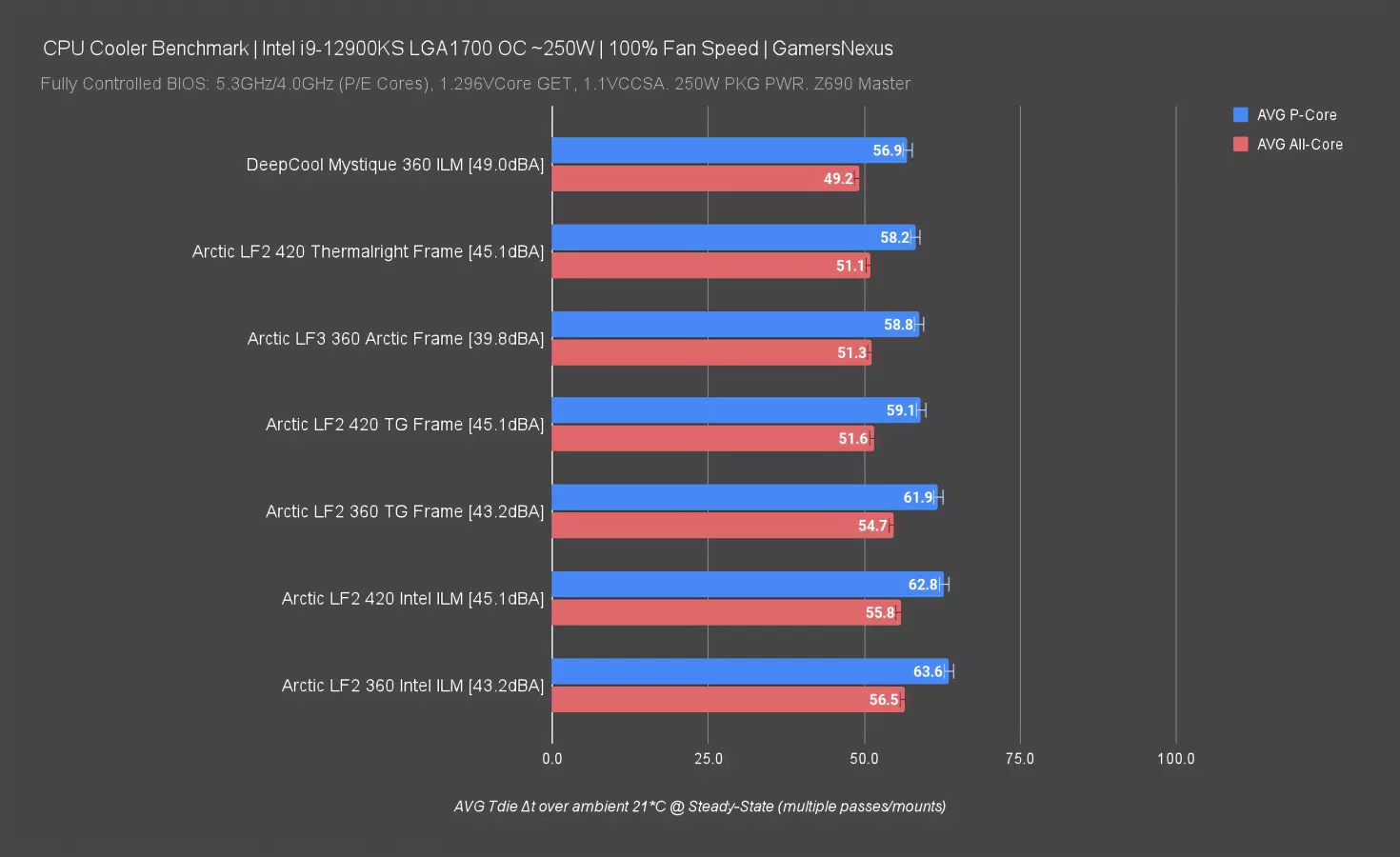 The Liquid Freezer III 360 is the new chart leader, up at 46.7 degrees Celsius over ambient. It’s the new “technical best,” only leading the brand new DeepCool Mystique 360 by margin of error. Between these, you’d buy on other features -- like looks, ease-of-installation, VRM cooling, or most likely, price and value.