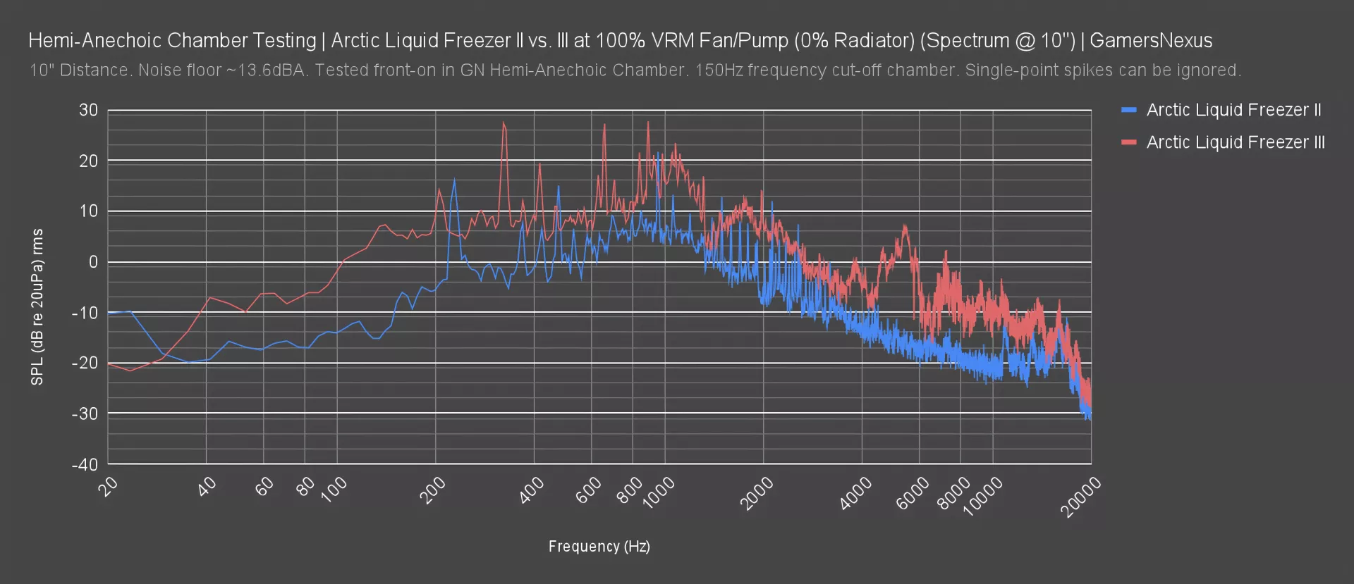 Here’s the chart. In this benchmark, you can see that when both fans and pumps are at maximum speed -- so we’re not normalizing for fan speed, we’re just letting them run flat-out -- and the new pump and fan combo at 100% definitely runs louder; in fact, the perceived increase to the human ear is nearing 2x louder. As for frequency spectrum, the new pump and fan have a spike around the 5,000Hz range and compared to the predecessor, a louder bump in the 1800Hz range.