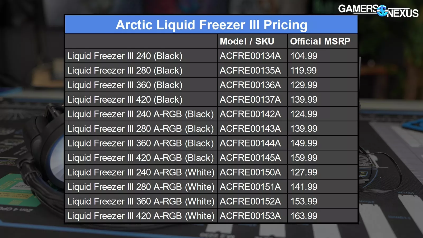 The Liquid Freezer III has blackout and RGB versions. Pricing for the most relevant options is $130 for the LF III 360 (Black), $150 for the A-RGB variant of it, $120 for the LF III 280 (Black), $140 for its A-RGB variant, and $140 for the LF III 420 (Black). They’ll also have a 240 model, but we generally try to stay at 280 and up these days for liquid.