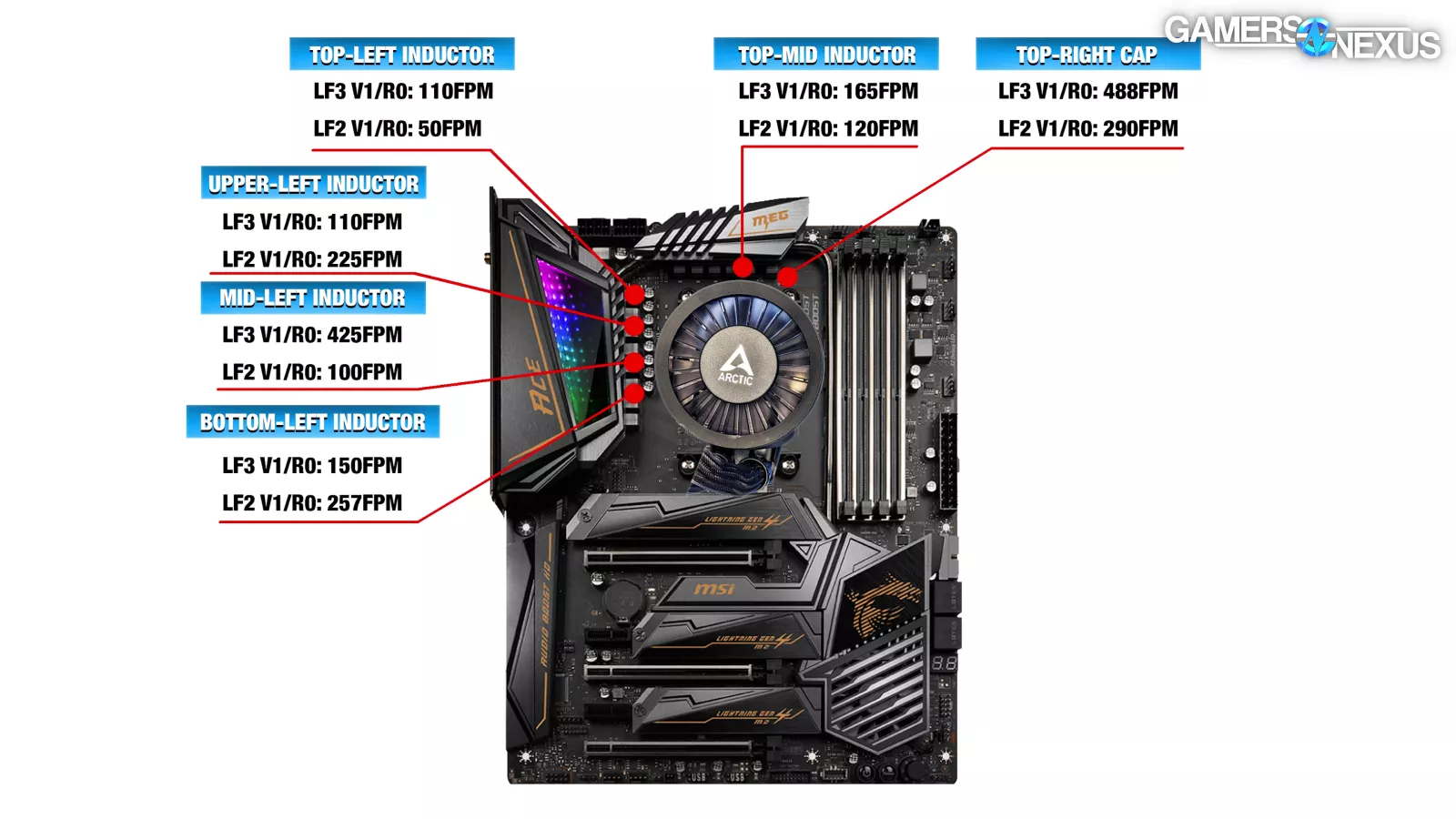 Testing was done by taking a hot wire anemometer to various places around the pump block. We positioned the anemometer mostly atop inductors, as that’s where the air needs to hit in order to reach the heatsink, and oriented the inlet toward the fan. The same test locations were used for the LF II (watch our review here)and LF III.