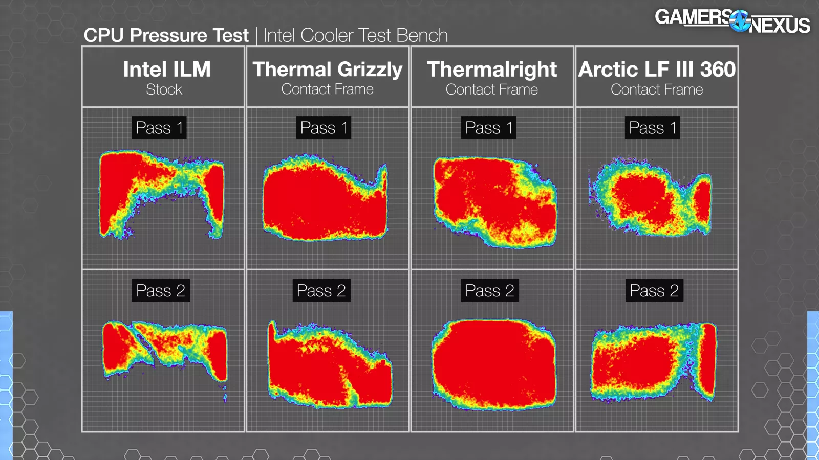 First on the left, we have the Intel stock ILM when using a Liquid Freezer II 420 -- the same one we used for our debut contact frame analysis almost two years ago. We can’t use the Liquid Freezer III here because, again, it doesn’t have an ILM mounting option. The Intel stock ILM was sorely lacking in pressure on the bottom edge of the CPU, with the right edge pointed toward the VRM. Intel is weak here overall and has its pressure in the wrong places.