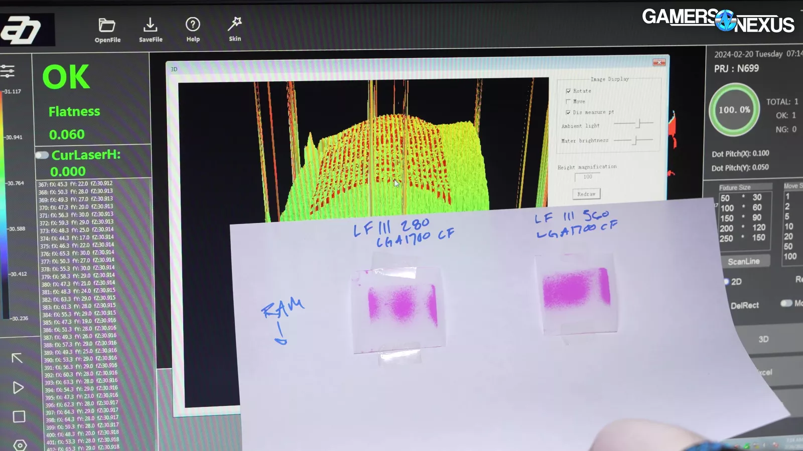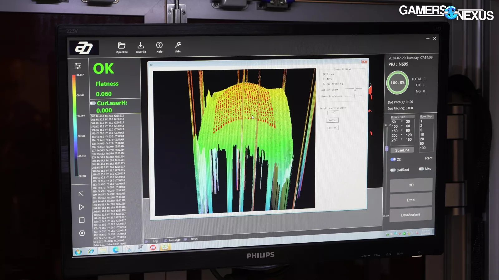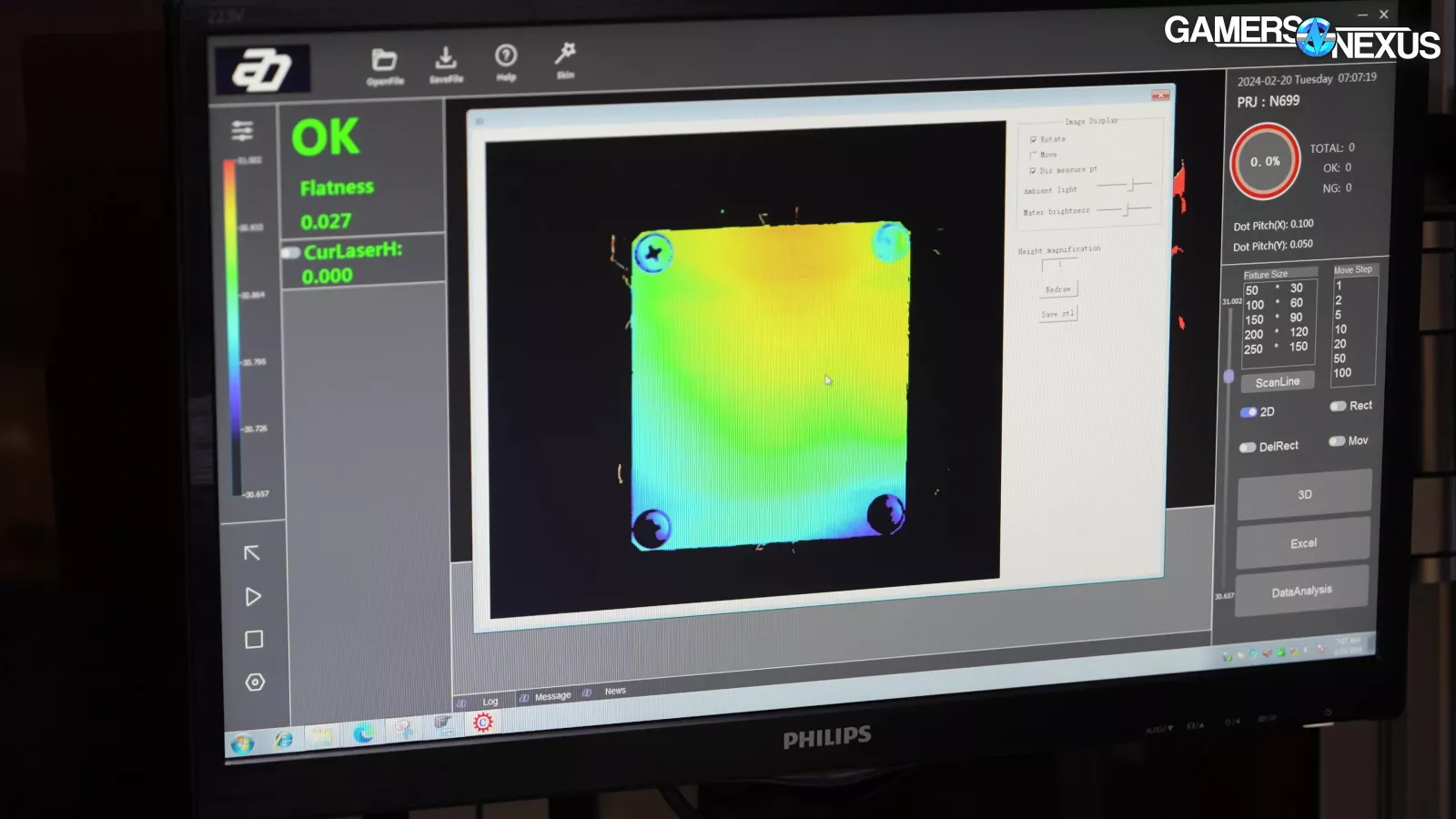 Here’s the scan. After adjusting the scanlines and levelness of the cold plate, we eventually ended up with this result. Without magnifying it, everything looks relatively flat. We have a maximum point-to-point delta of 60 microns, but an overall good consistency one point to its adjacent neighbor. We were hoping this would reveal that channel we identified in the LGA1700 mounting pressure map, but because we can’t conduct this scan while the cold plate is mounted to an IHS, we can only see the unsprung version.