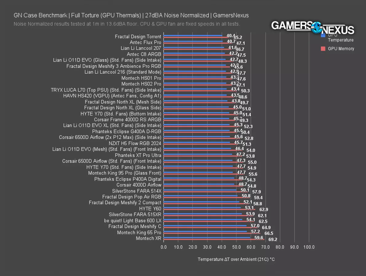 That's an arrangement that's worked well for CPU cooling in the North XL (read our review) and Torrent using our test bench, and evidently it works extremely well in the Meshify 3, which is now the coolest case on the chart. The Torrent was a little warmer than the Meshify 3 at 42 degrees above ambient, while the Meshify 3 is instead tied with the previous best results from the Lian Li Lancool 216 (watch our review) and Lancool 207 (read our review). The Antec Flux Pro is a case that Fractal is likely specifically targeting for competition and, like the Lian Li cases, it's within one degree of the Meshify 3. This test is a weak point for the Antec C8 ARGB, which averaged 50 degrees due to its bottom intake layout.
