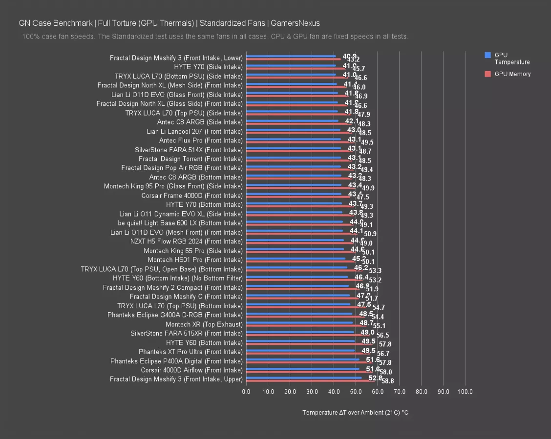 As for the other highlighted competitors, the Antec C8 ARGB averaged 42 degrees and the Flux Pro averaged 41. Technically they both beat the Meshify 3's 43 degree average, but they're all among the best performing results on this chart.