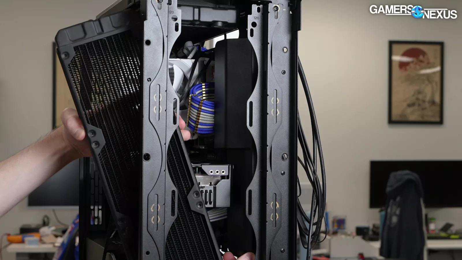 All Meshify 3 SKUs ship with three front fans preinstalled, so this is less of an issue than it would be on a bare chassis. When fans are installed on the rails, the fans and rails can be removed as a single unit by undoing two screws, which is awesome.