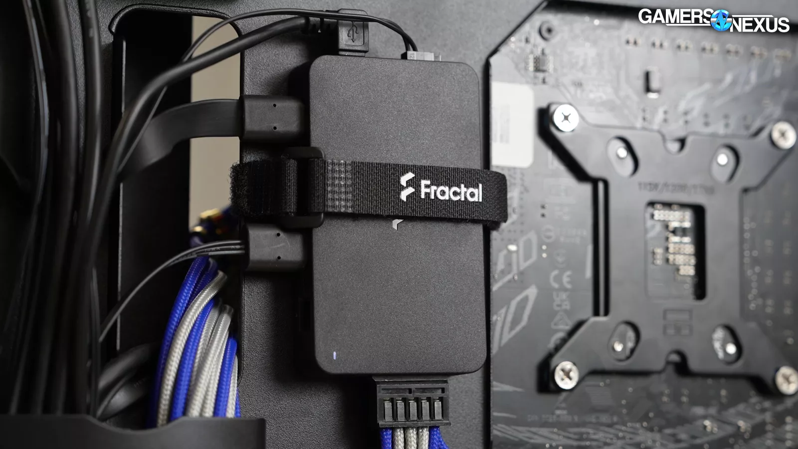 For reasons we’ll explain in the fan control section, we had no way to skip the fan hub and connect the fans directly to the motherboard as we usually would for testing. We validated that the fans reached their rated max speed of 1,800RPM +/- 10% with a laser tachometer. However, the tach signal sent back by the Fractal Adjust Pro hub doesn't line up with standard 4-pole fan behavior: HWiNFO misreports 2295 RPM when the fans are really spinning at just over 1,800 RPM in reality. Fractal's software accounts for this and reports RPM accurately.