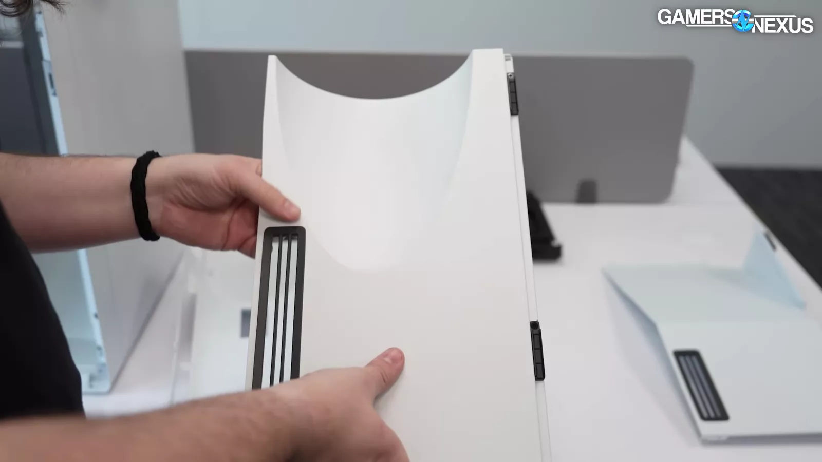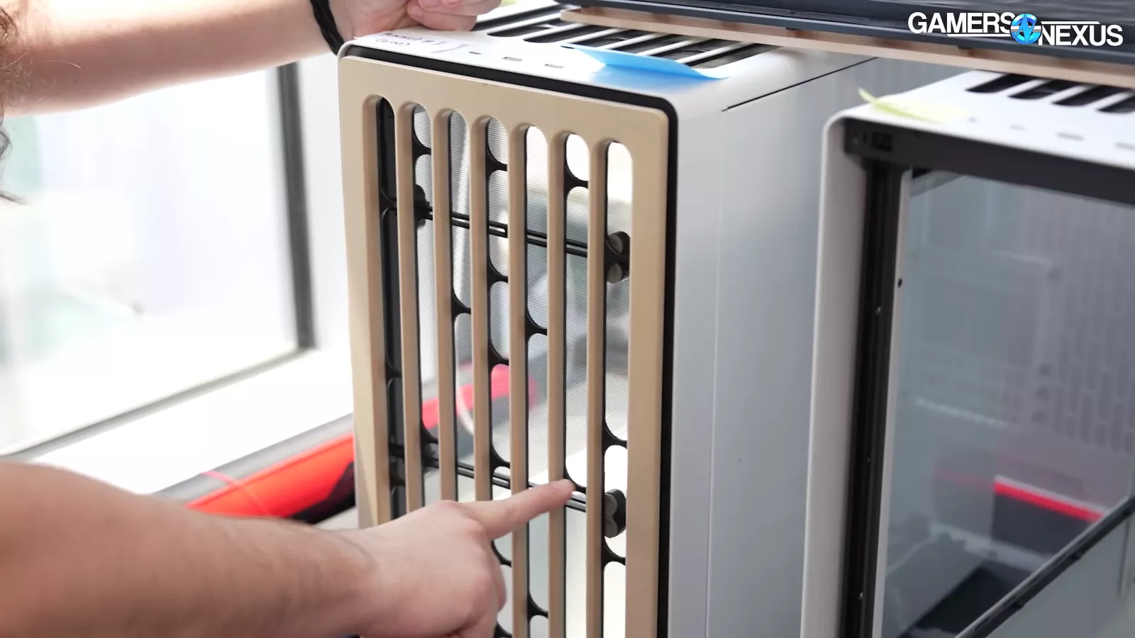 HAVN showed us 3 different prototypes for the front panel of the case. The first one we looked at featured a wood panel design, which we’ve seen on a lot of cases lately. Wood has certain manufacturing challenges to consider. The white panel you see above is made of aluminum, which is very expensive.