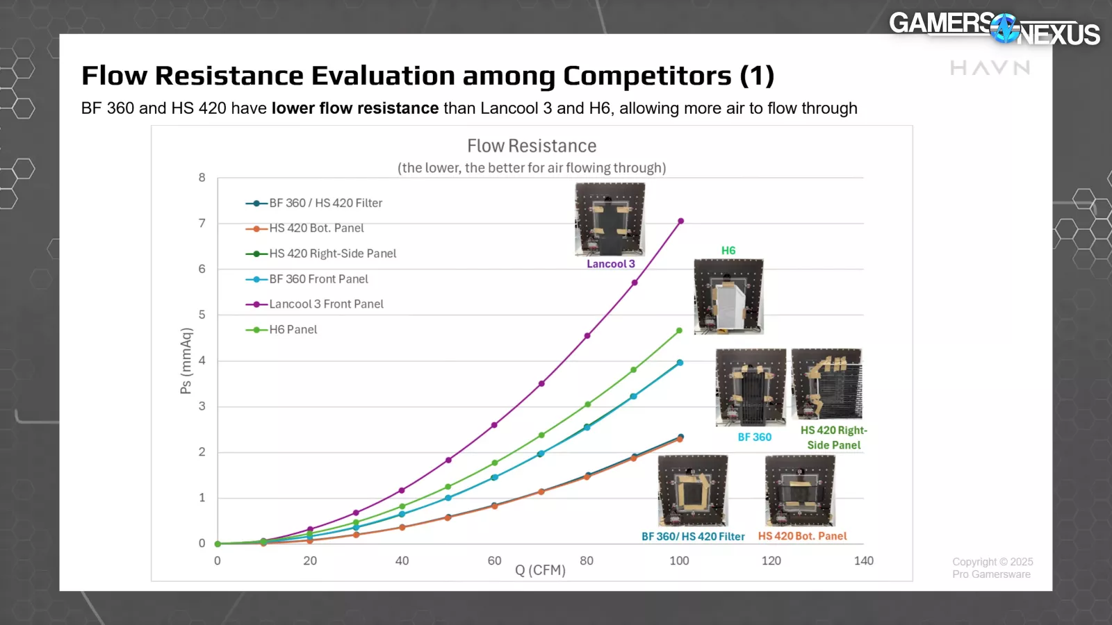 HAVN didn't shy away from competitive comparisons. The company says its BF 360 with its final front panel, shown above in light blue, had competitive performance against the H6. They also suggest significant reductions in flow resistance (which is a good thing) versus the Lancool 3, with the HS 420 also making some appearances here.