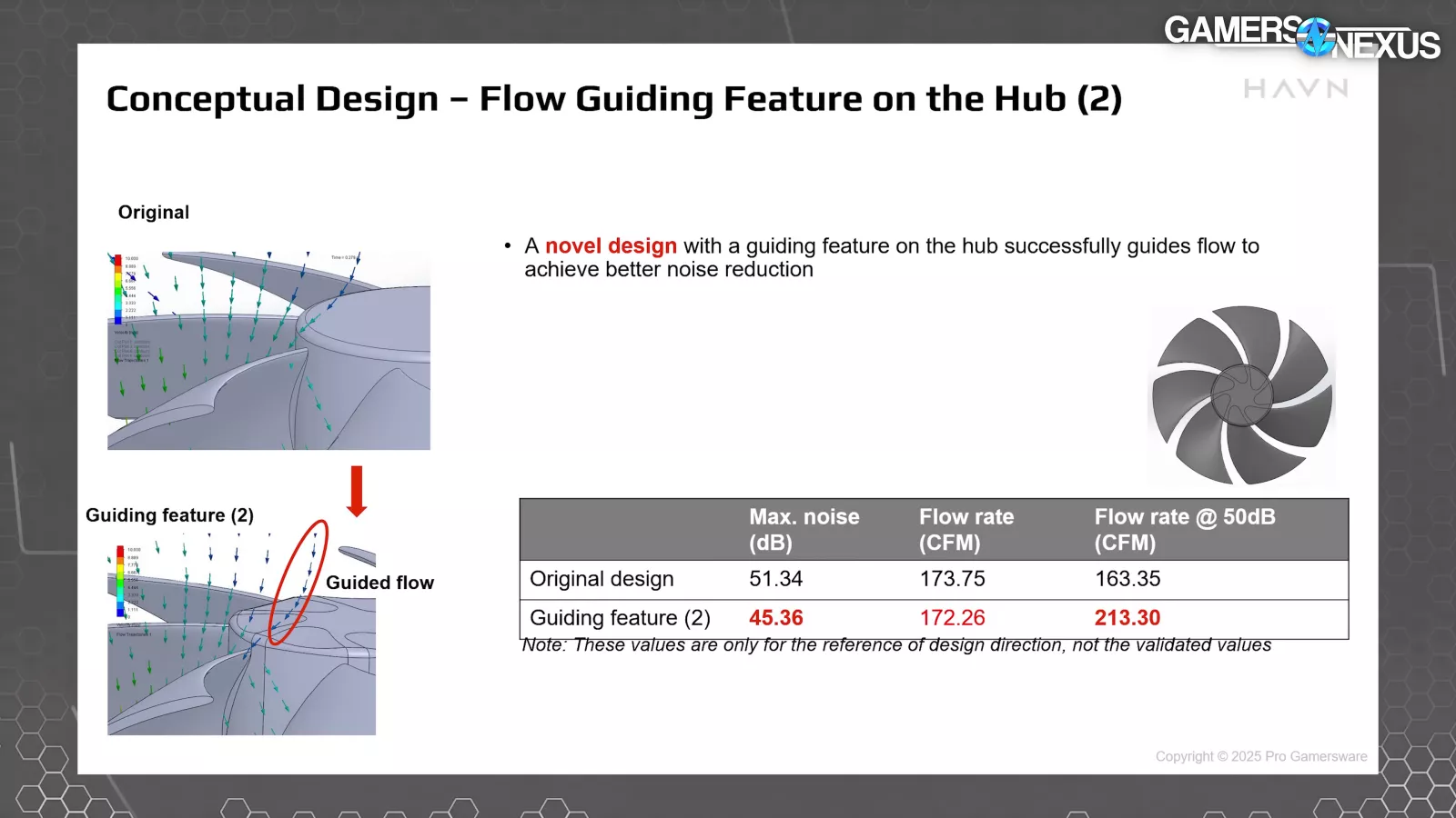 By shaping the fan hub itself to guide flow, HAVN claims that it can better maintain pressure across the hub of the fan and along the inner wall of the blades. This is the area of worst performance in every fan, so optimizing here can also help minimize dead zones behind the hub. HAVN says that the molded flow guide in the hub benefited its noise significantly. The company claims its flow rate also improved significantly for the guided hub.