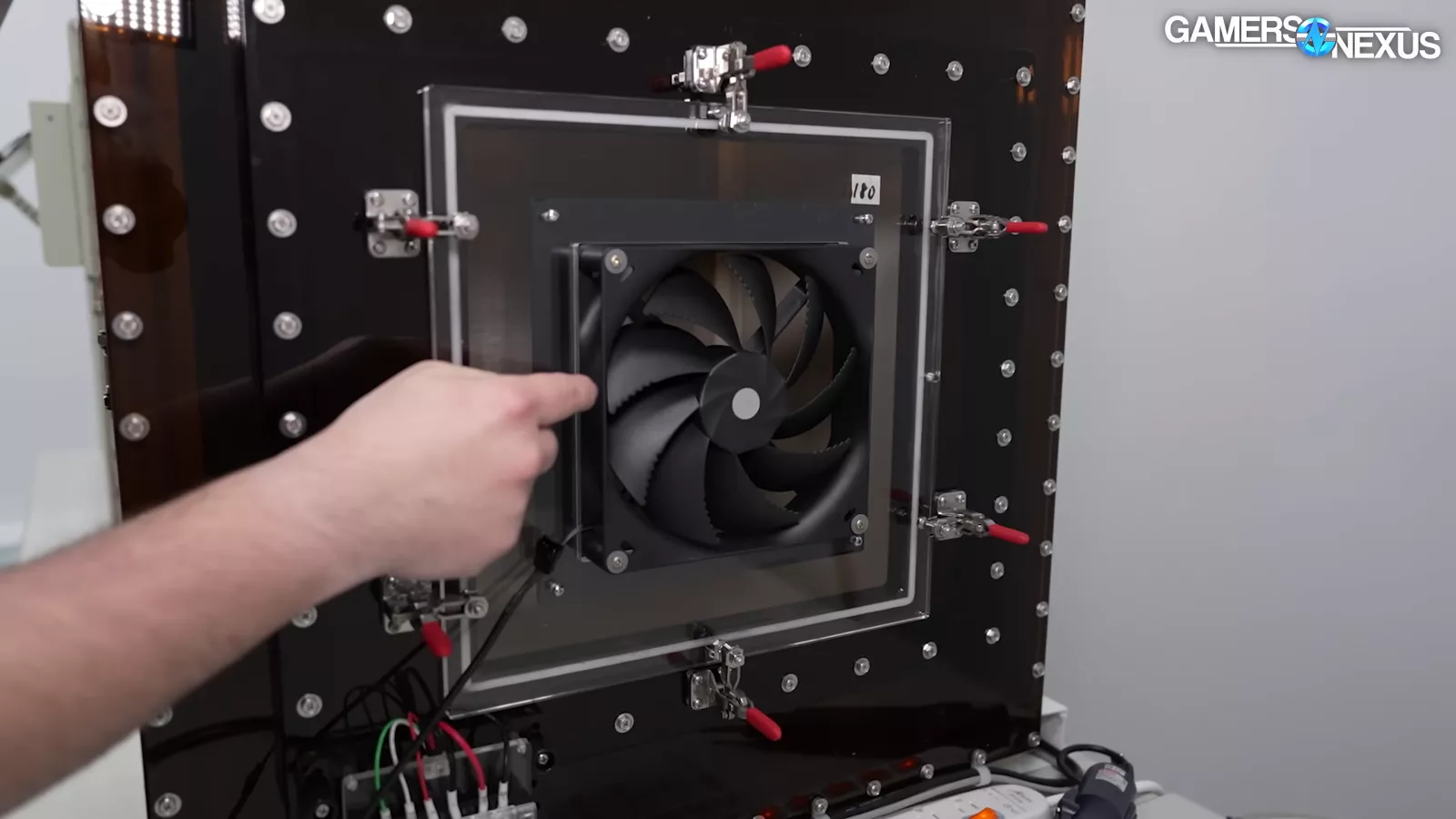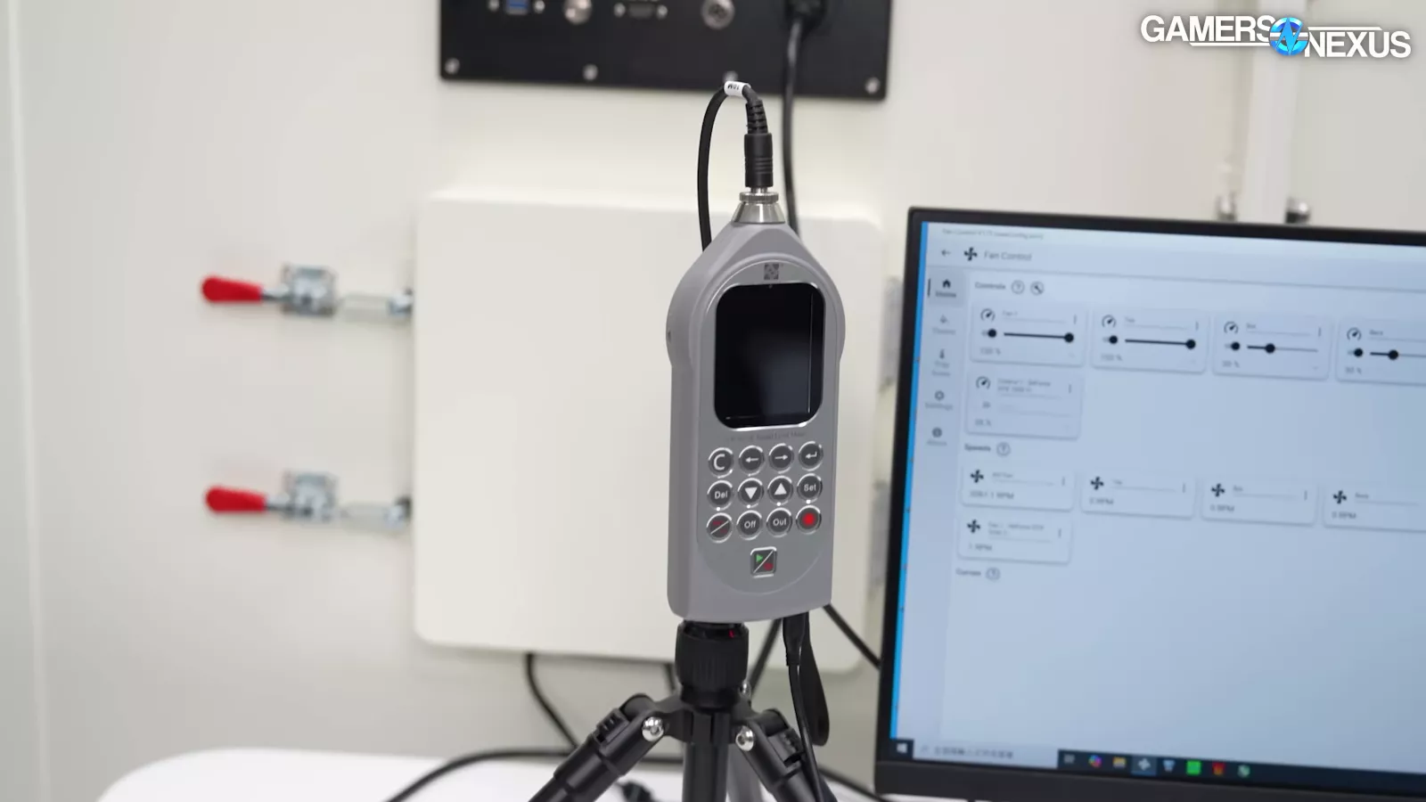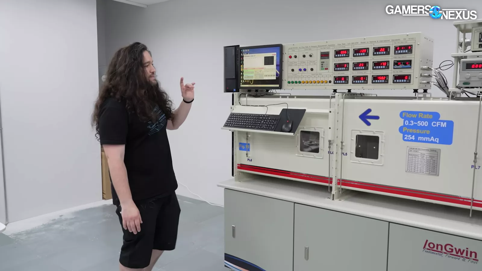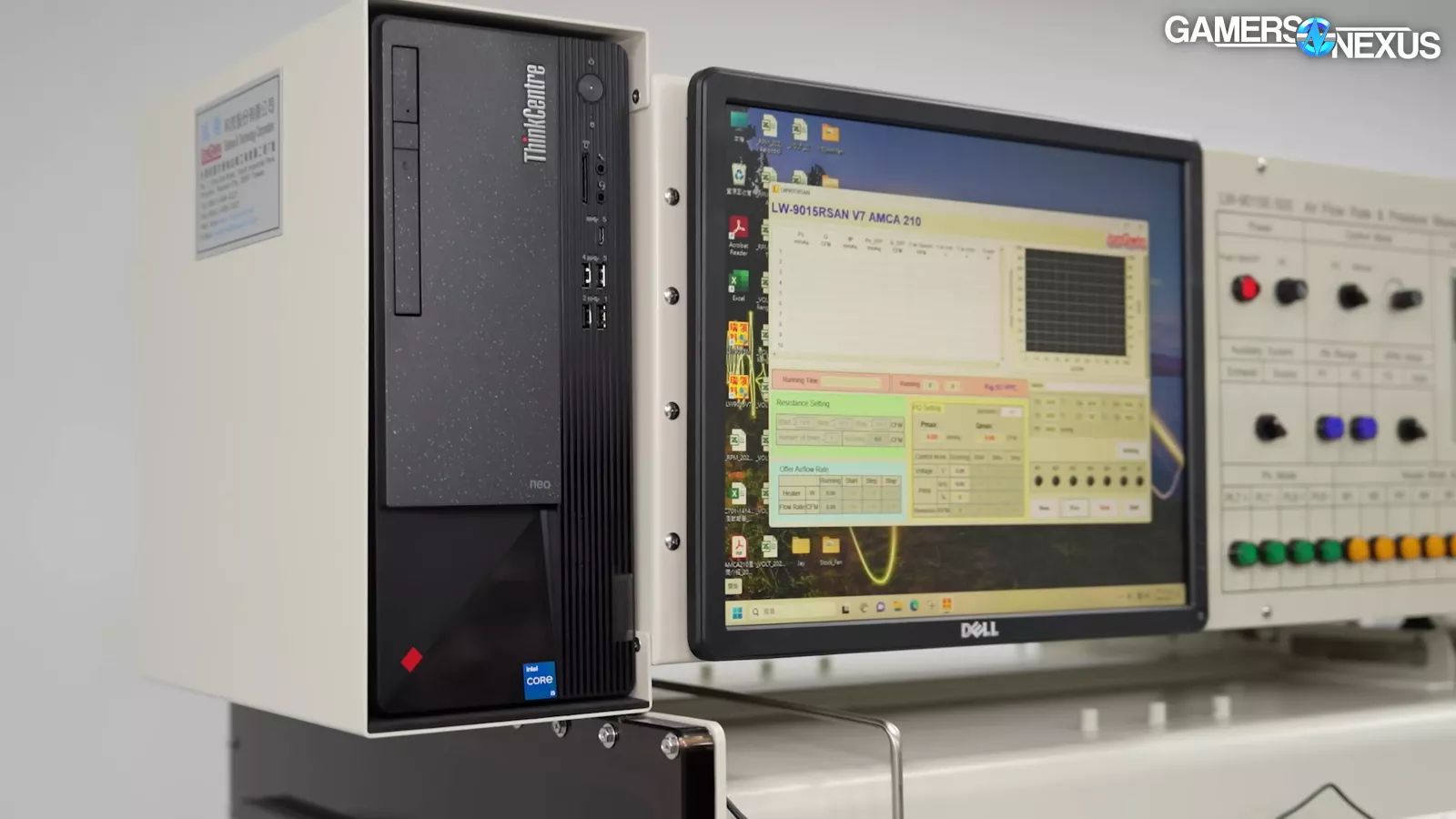 The company also had a flow-rate tester, which is similar to ours, that can do PQ charts, which the company used to test its new fans. It has a throttle control and a laser tachometer, which provides a reading of the speed of the fan. On one side of the flow-rate tester, there are tubes for the counter blower, which our system also has. Their flow-rate tester also has an air compressor, which is used for actuating some of the nozzles inside the system. We also saw that their flow-rate tester also came with an inexpensive desktop OEM computer (in this case, a ThinkCentre PC running an i5-12400).