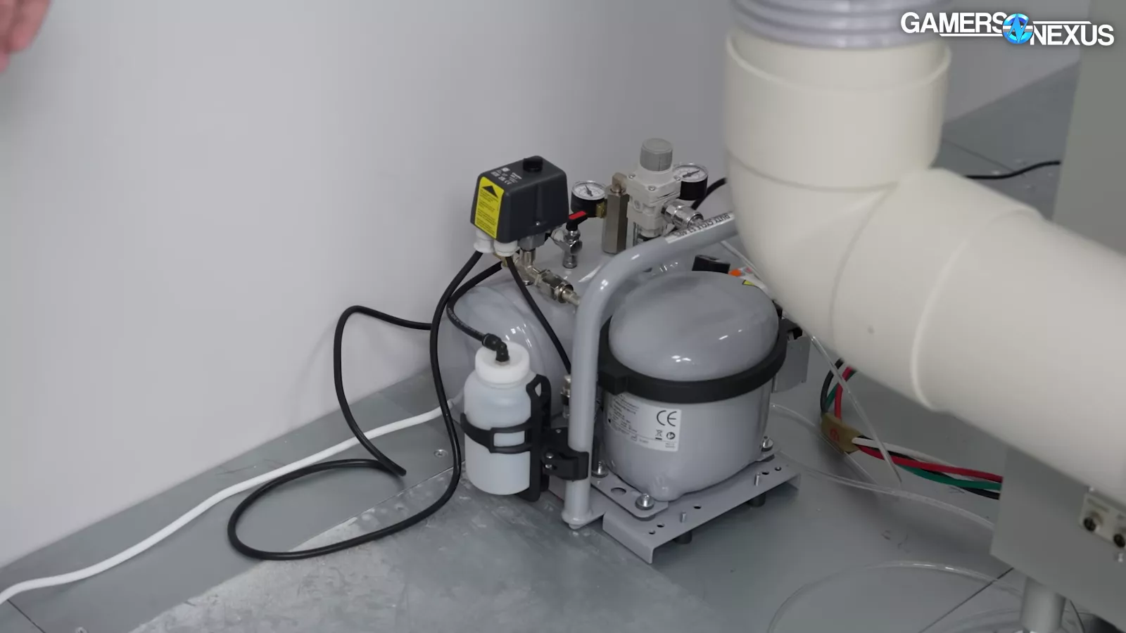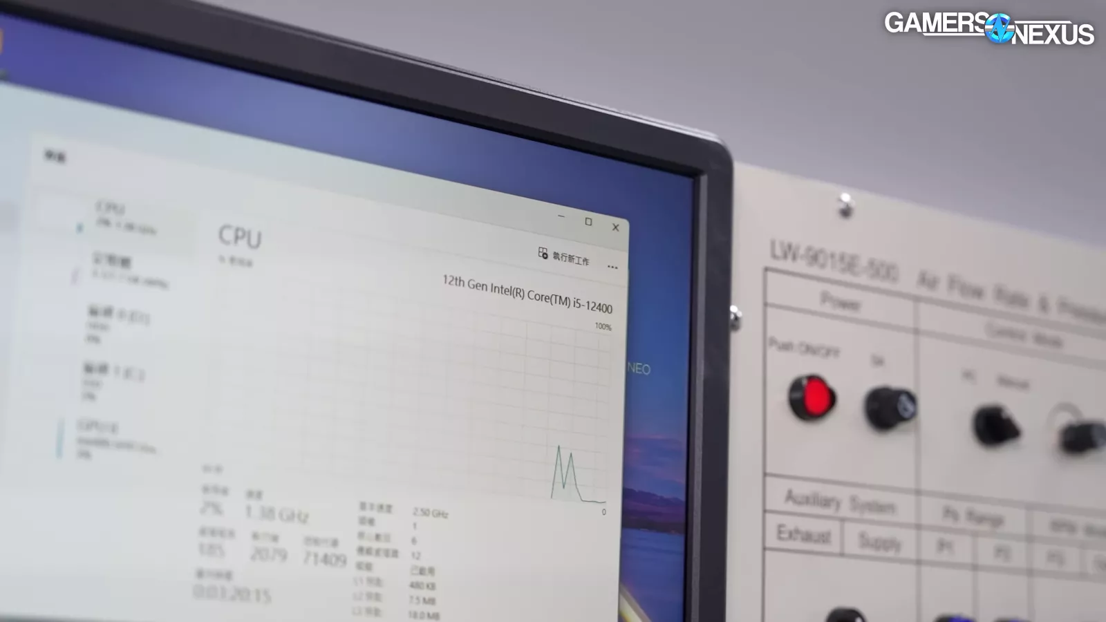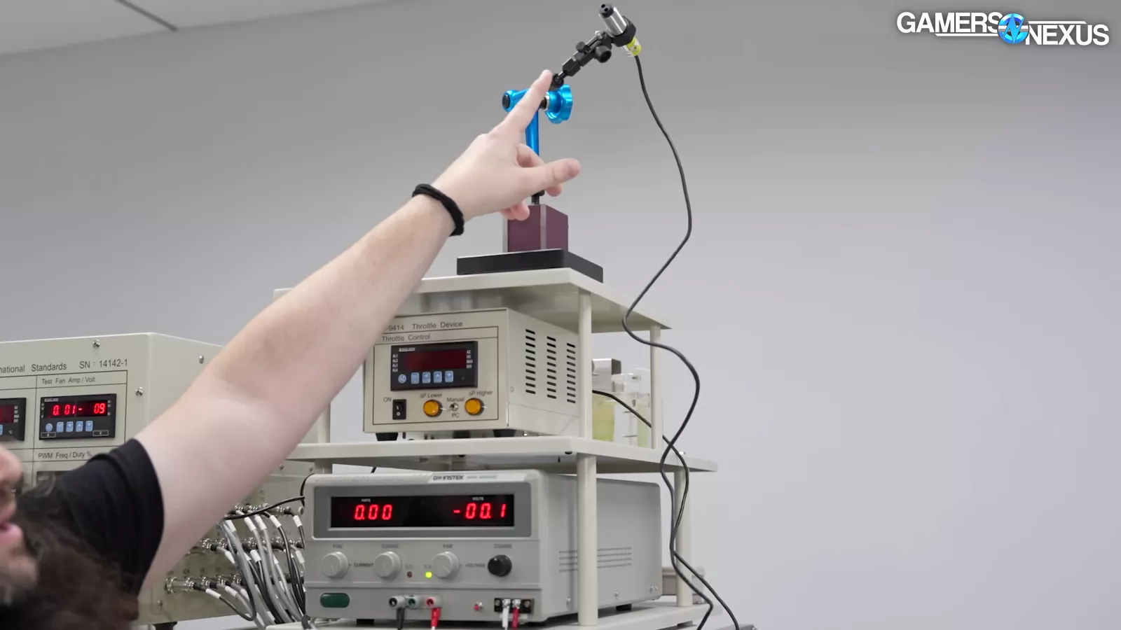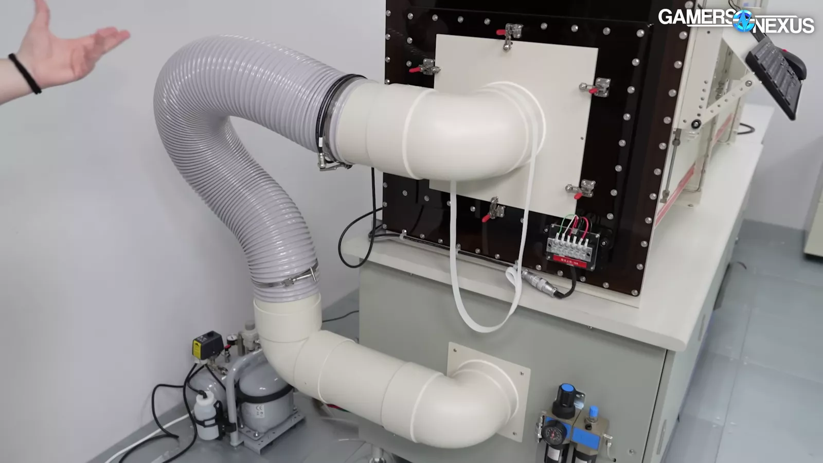 The company also had a flow-rate tester, which is similar to ours, that can do PQ charts, which the company used to test its new fans. It has a throttle control and a laser tachometer, which provides a reading of the speed of the fan. On one side of the flow-rate tester, there are tubes for the counter blower, which our system also has. Their flow-rate tester also has an air compressor, which is used for actuating some of the nozzles inside the system. We also saw that their flow-rate tester also came with an inexpensive desktop OEM computer (in this case, a ThinkCentre PC running an i5-12400).