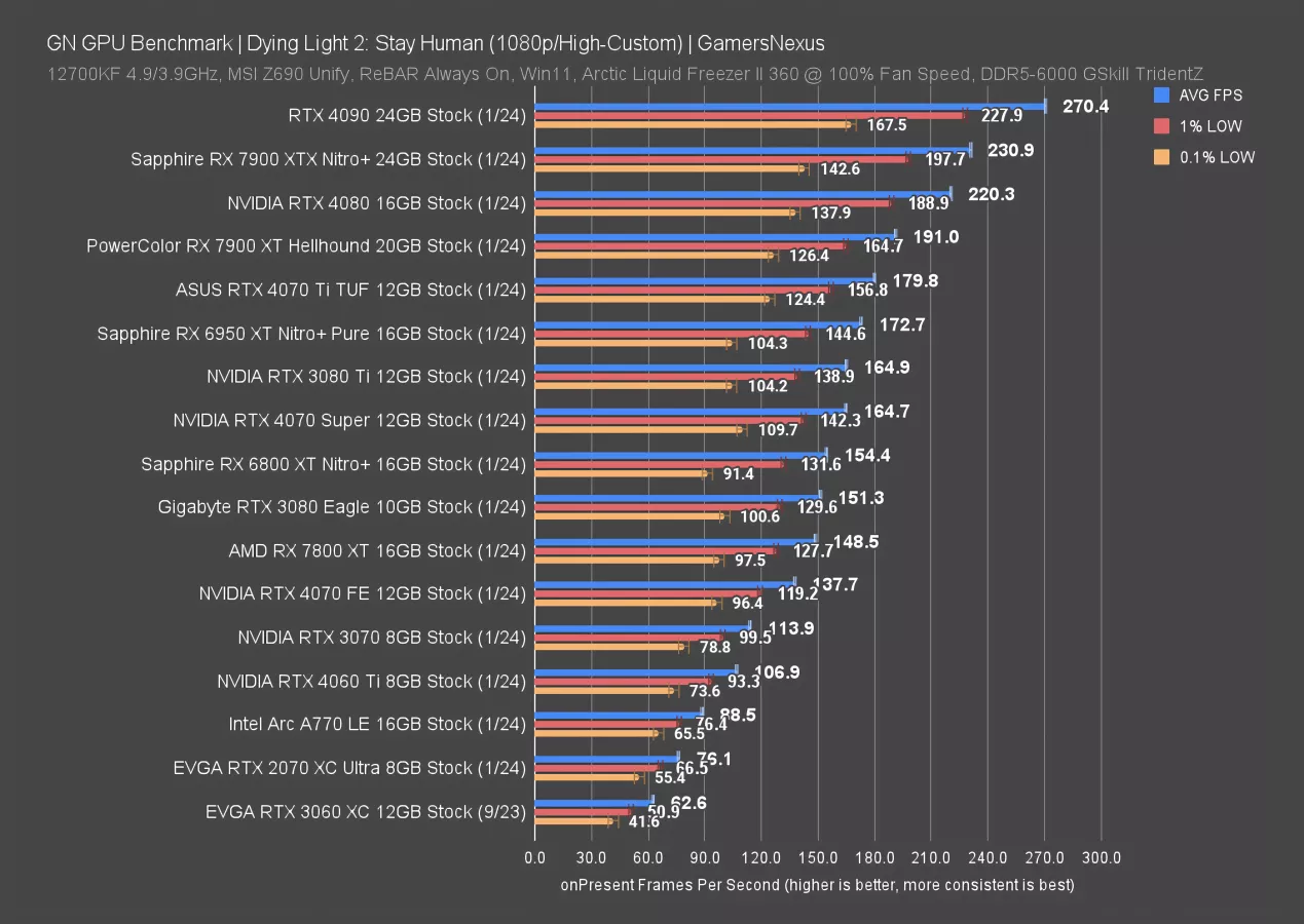 Finally, at 1080p, the 4070 Ti runs at 130 FPS AVG, leading the 4070 Super by just 9.5%, The 4070 Super is 18% ahead of the 4070 and 51% ahead of the 3070 once again. AMD’s 7900 XTX runs just behind the 4070 Ti and ahead of the 4070 Super.