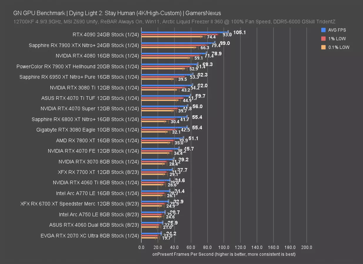 Now for Dying Light 2, another relatively new test addition. At 4K, the RTX 4070 Ti ran at about 60 FPS AVG, leading the 4070 Super by a reduced and uneventful 6.6%. The 4070 Super leads the 4070 FE by 22.5%, then the 3070 by 42.9%. That has the positioning against the 4070 a little higher than in other games, although still within a reasonable range.