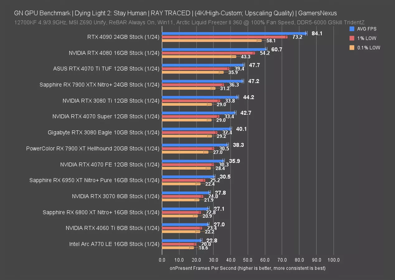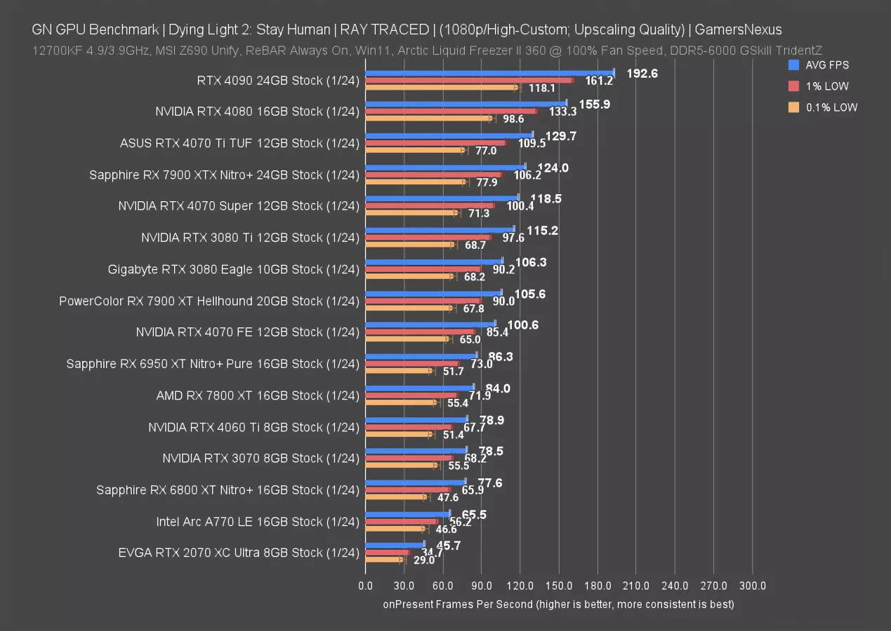 In Dying Light 2 with high RT and DLSS quality or equivalent settings for FSR and XeSS, we end up with this chart. The RTX 4070 Super held 43 FPS AVG here, showing that these cards actually need upscaling to run with these settings. The 4070 Ti leads it by 12%, with the Super card leading the 4070 FE by 19% and the 3070 by 54%. These numbers are similar to what we saw when rasterized, painting no meaningful deviation between these NVIDIA devices with RT and DLSS. The AMD cards tumble down the stack some more, with the 7900 XTX now equivalent to the 4070 Ti and the 7900 XT closer to the 3080 when both are using upscaling.
